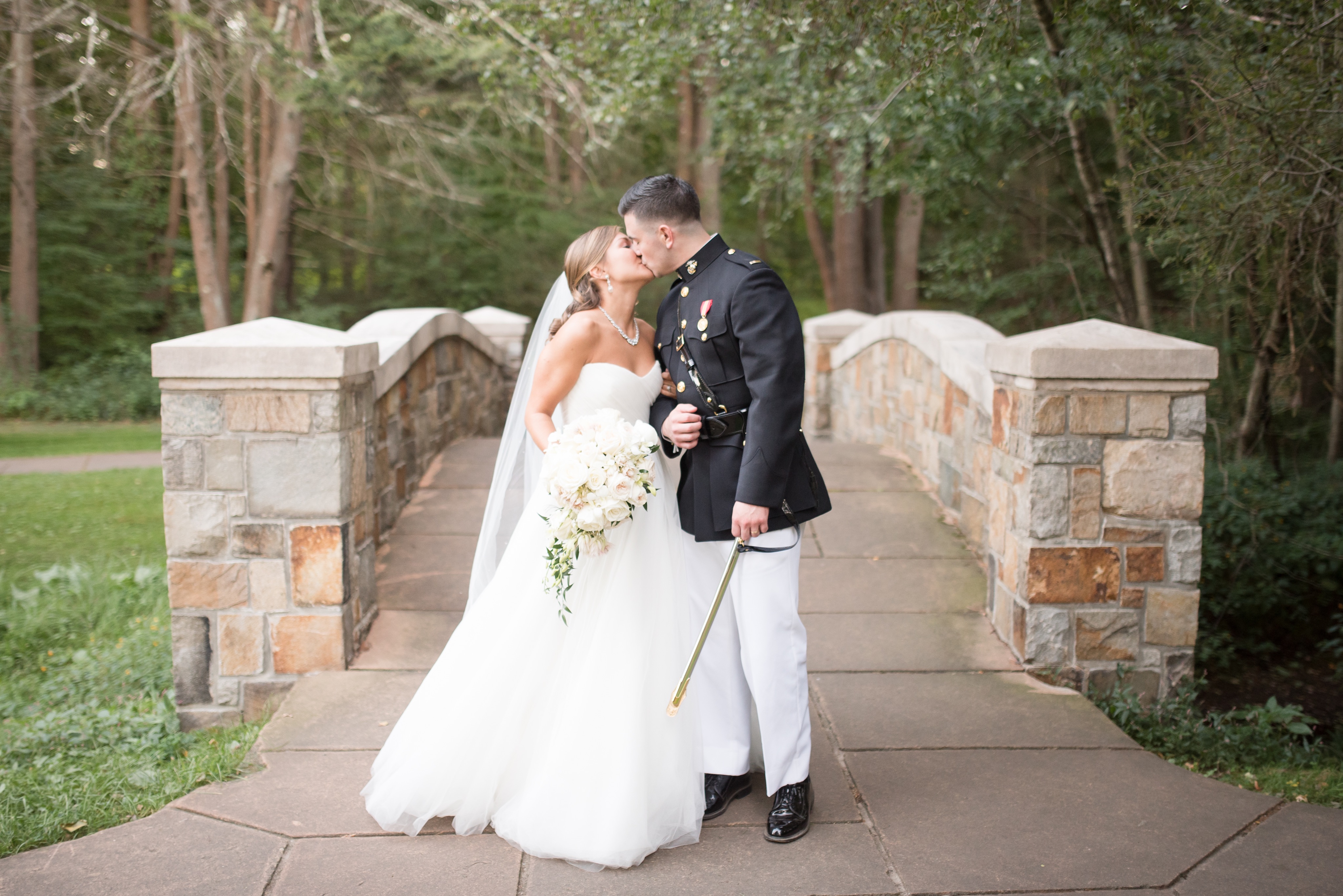 Painting of a bride and groom in military uniform kissing on a stone bridge.