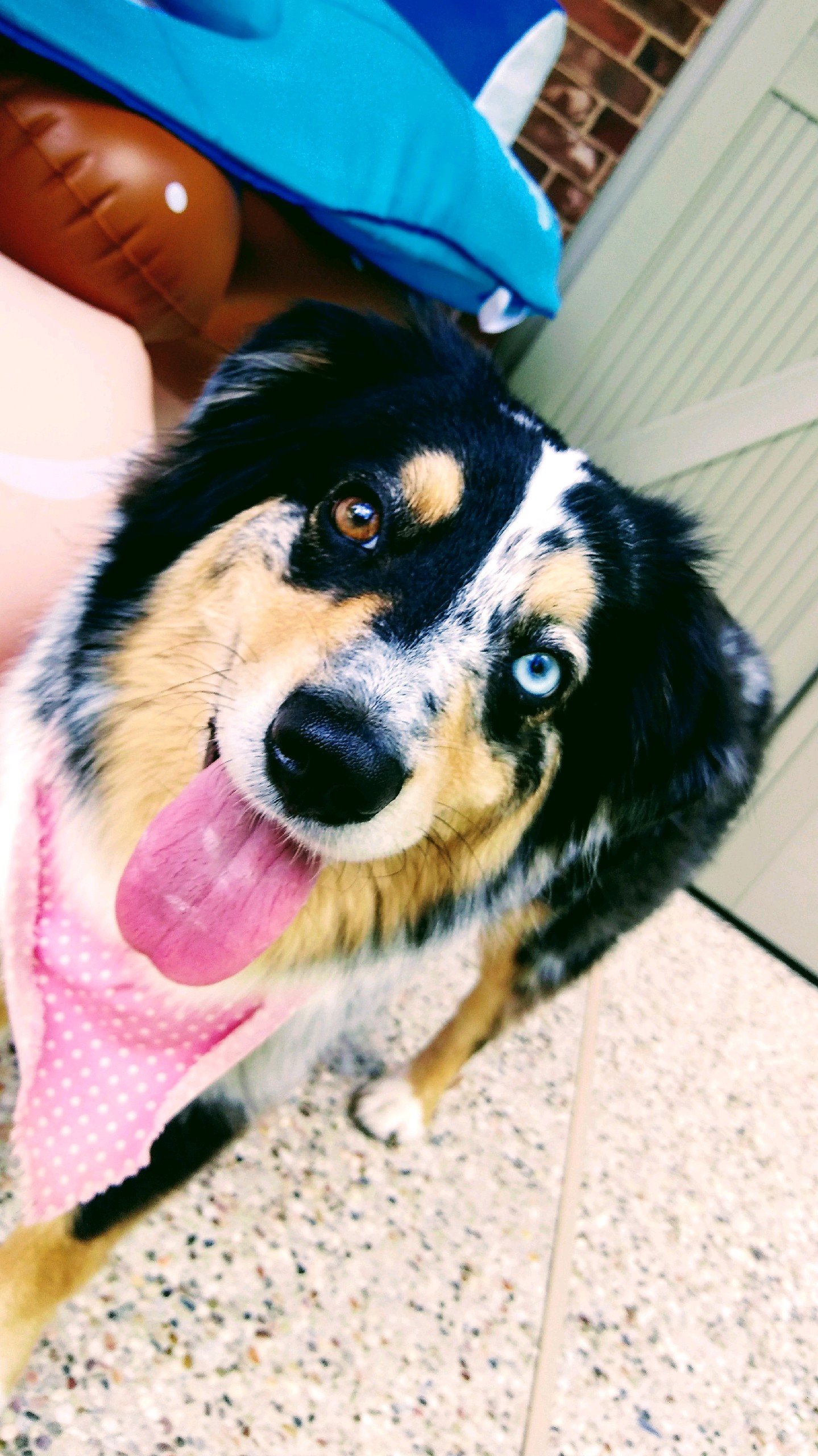 Painting of a dog with heterochromia iridum wearing a pink bandana.