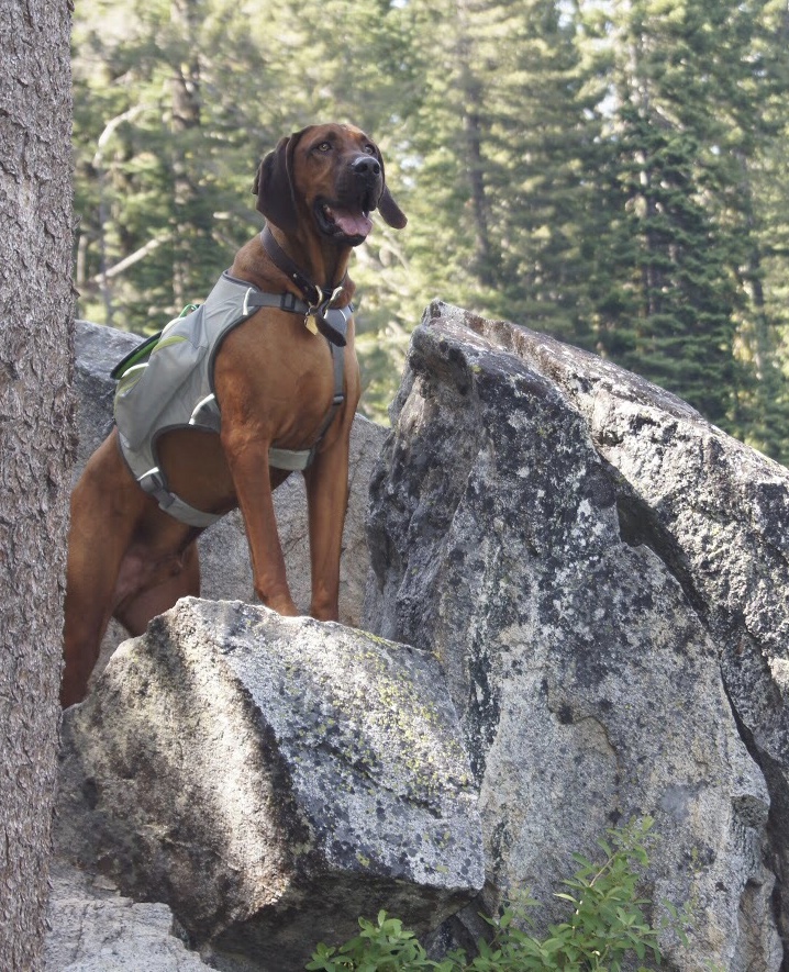 Painting of a Rhodesian Ridgeback dog wearing a backpack, standing on rocks in a forest.