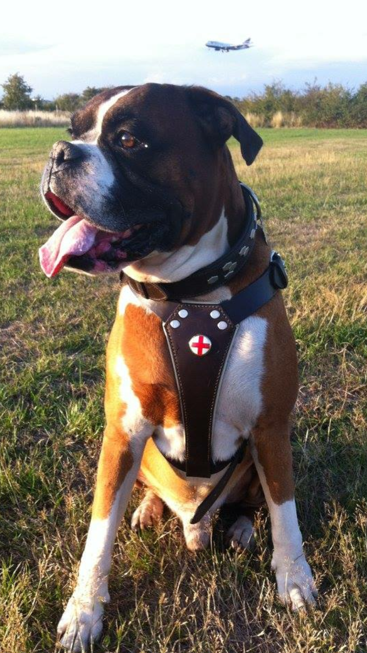Painting of a brindle Boxer dog wearing a harness, sitting in a grassy field with an airplane in the background.