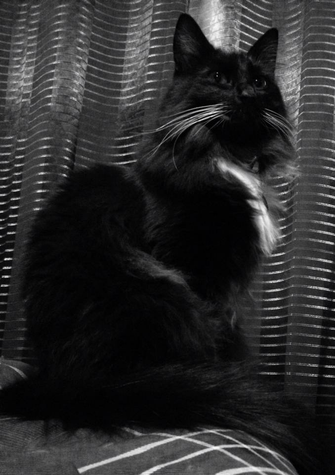 Painting of a black cat with green eyes