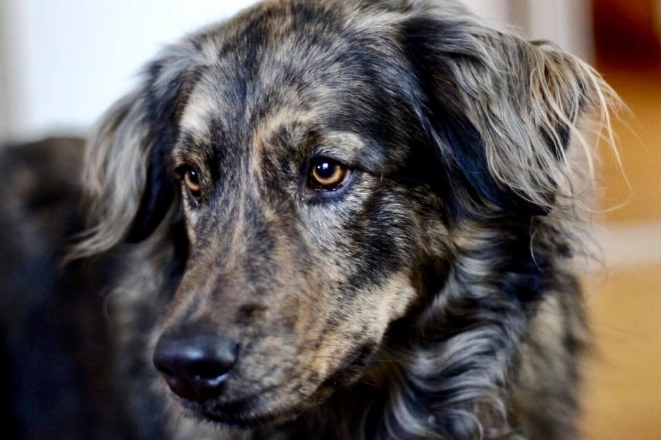 Painting of a gray and black dog looking to the side