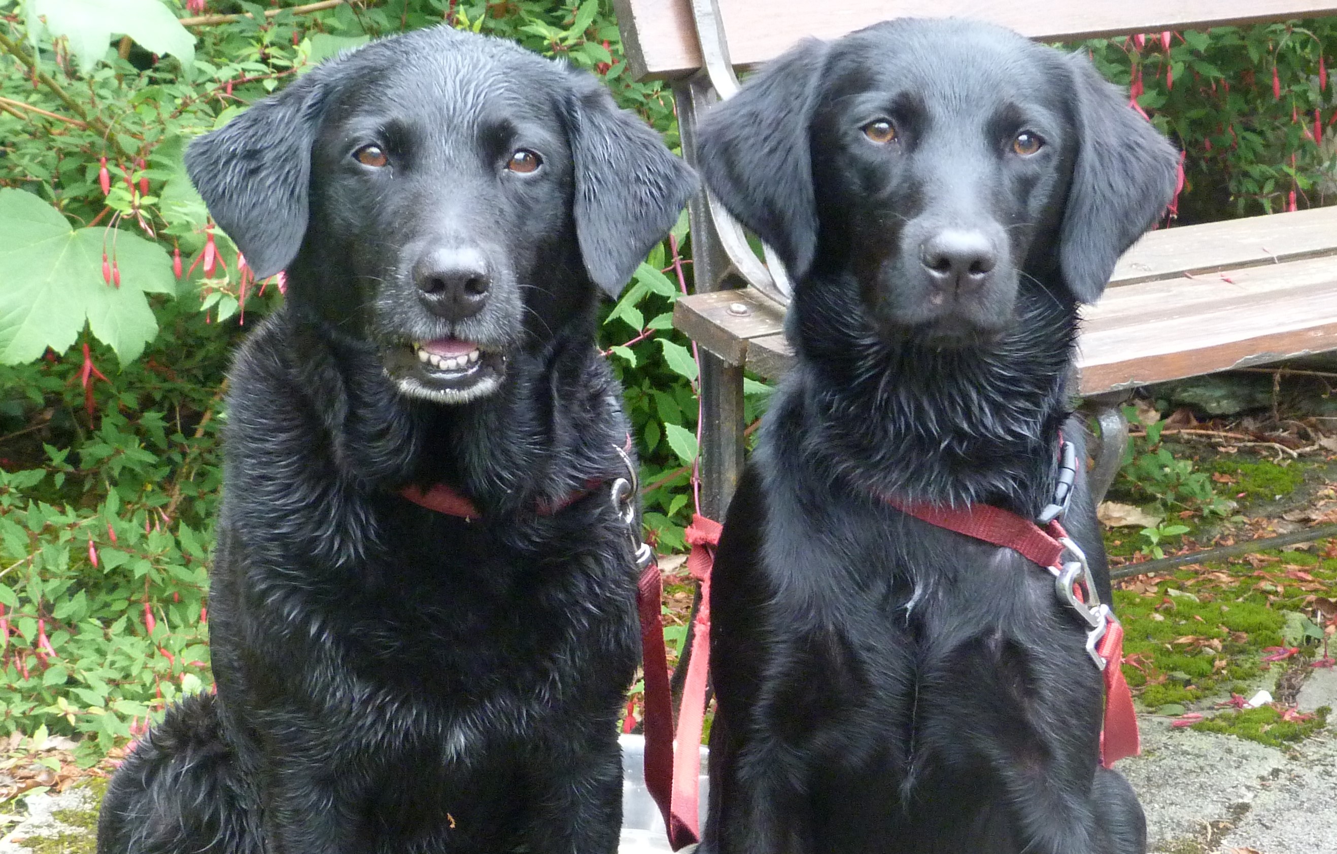 Painting of two black Labrador Retrievers sitting side-by-side.