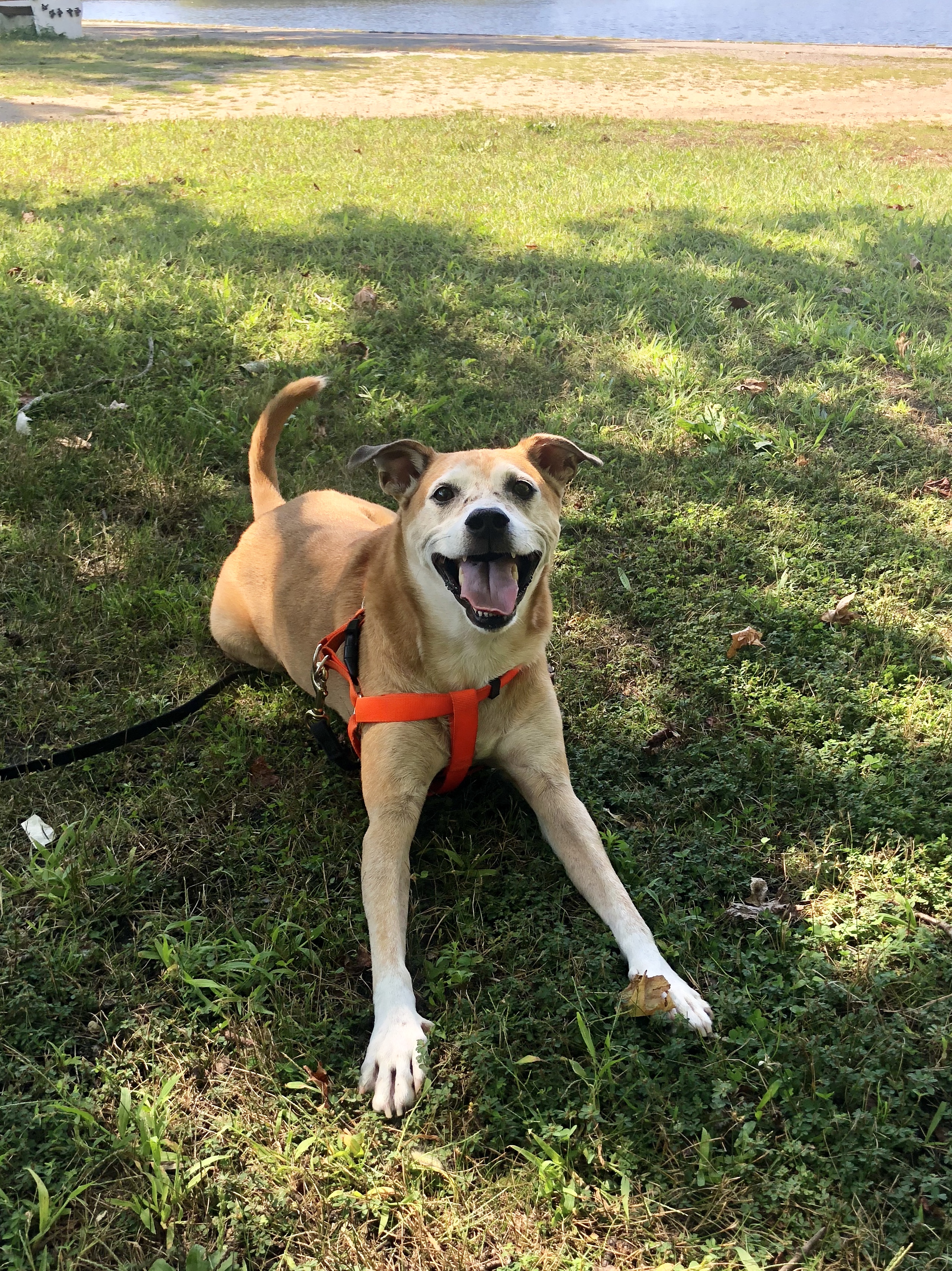 Happy tan dog in orange harness lying on green grass