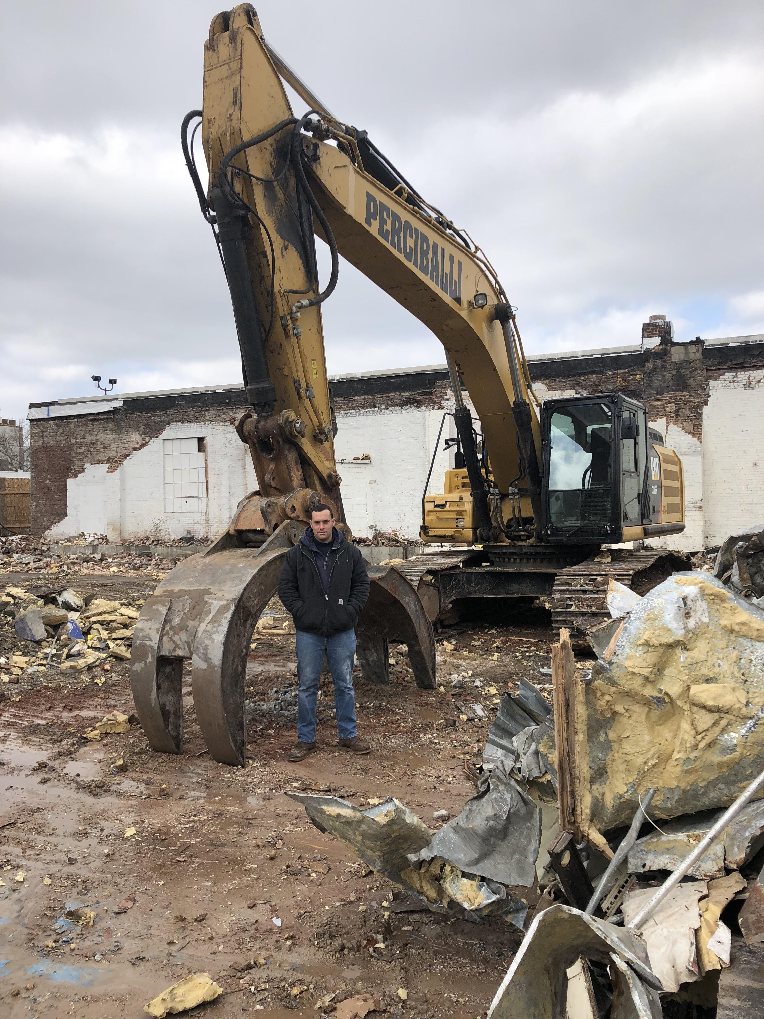 Painting of a man standing in front of a large excavator at a demolition site.