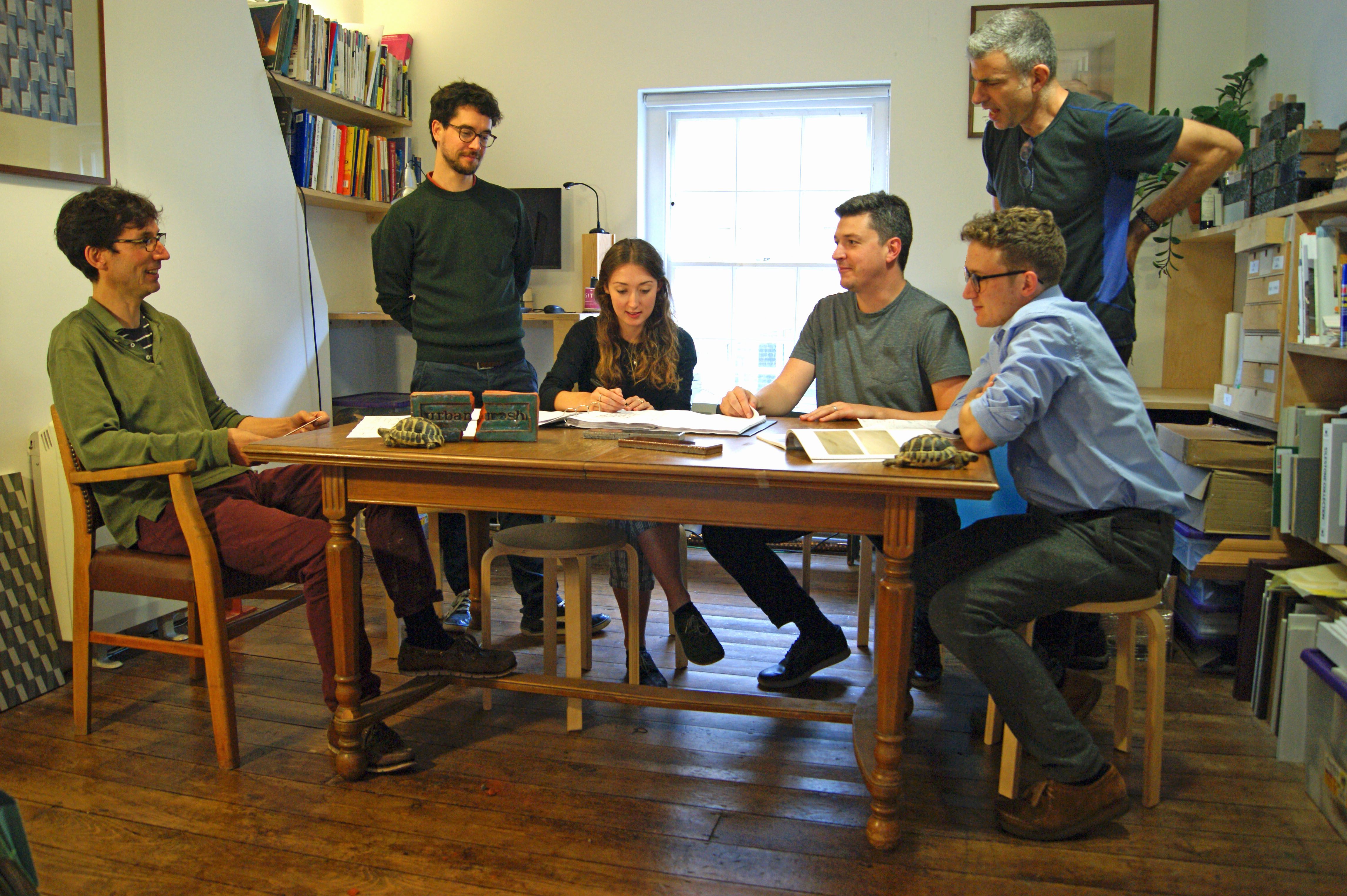 Painting of seven people sitting around a large wooden table, working, two small turtles are on the table.