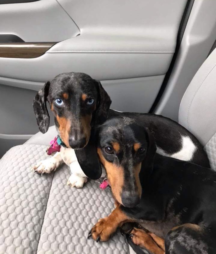 Painting of two dachshunds in a car seat.