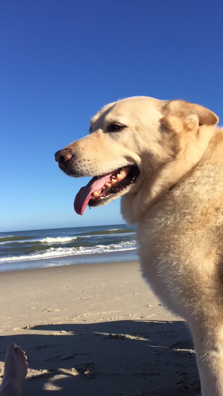 Painting of a yellow Labrador Retriever on a beach.