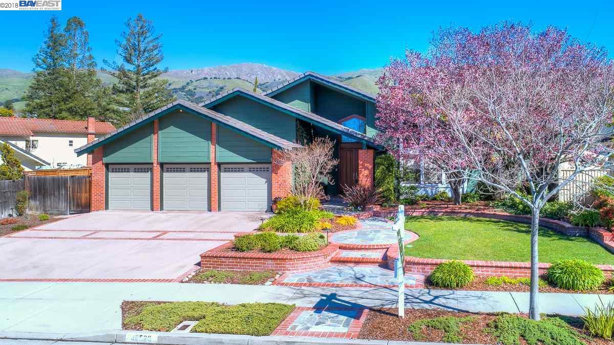 Watercolor painting of a teal and brick house with three-car garage, flowering tree, and landscaped yard.