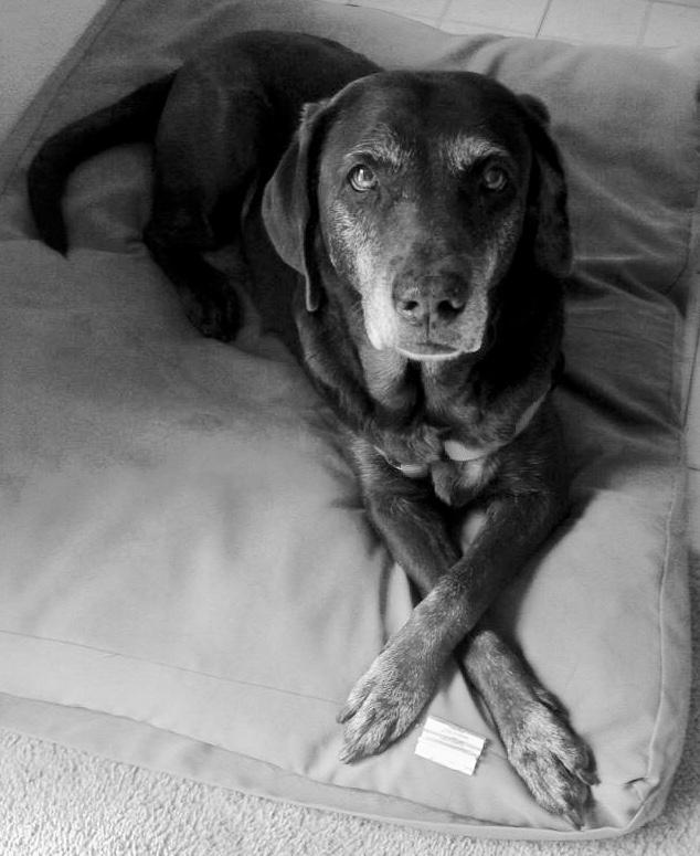 Black Labrador retriever charcoal drawing, paws crossed.