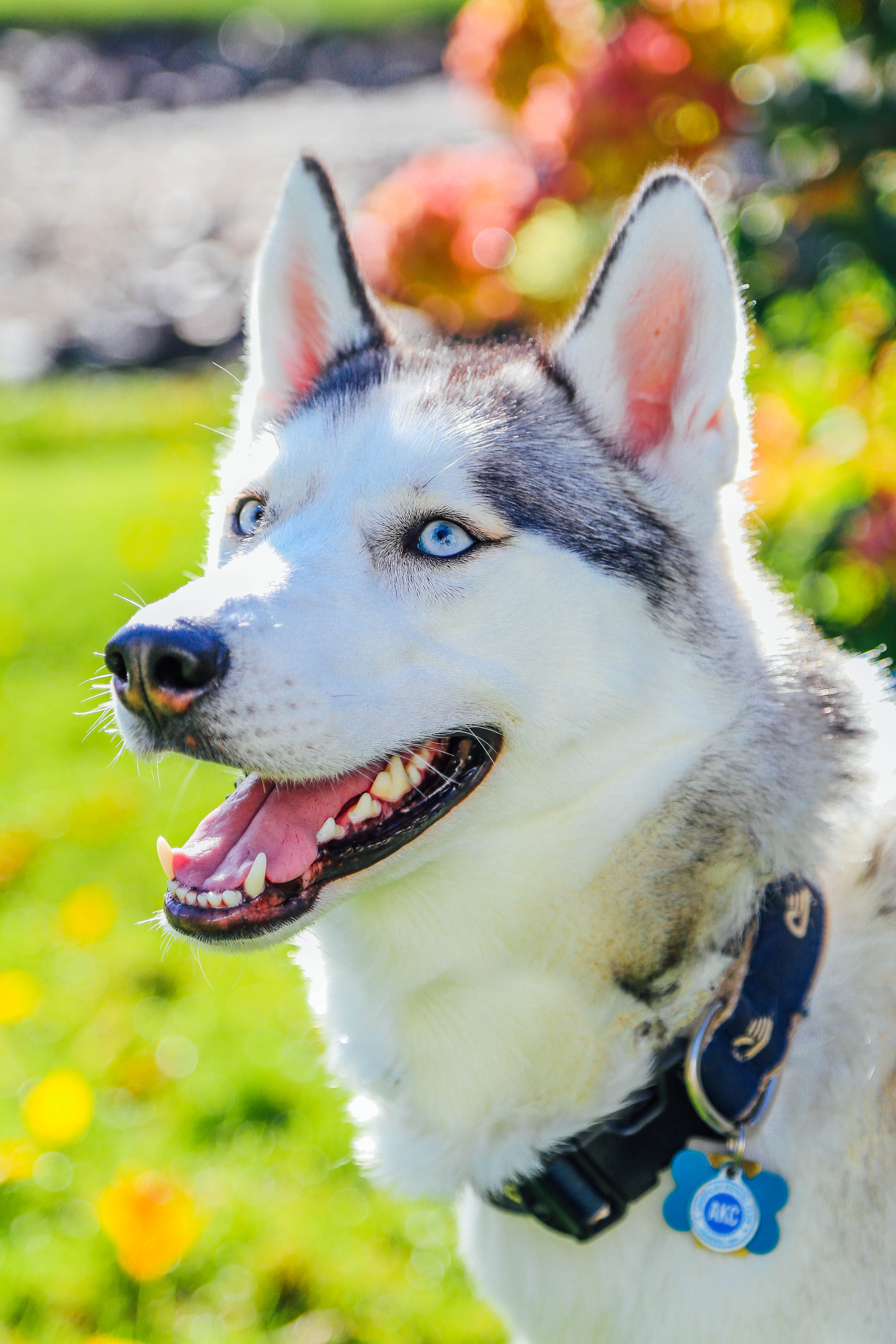 Colored pencil drawing of a Siberian Husky with blue eyes, mouth open, wearing a blue collar.