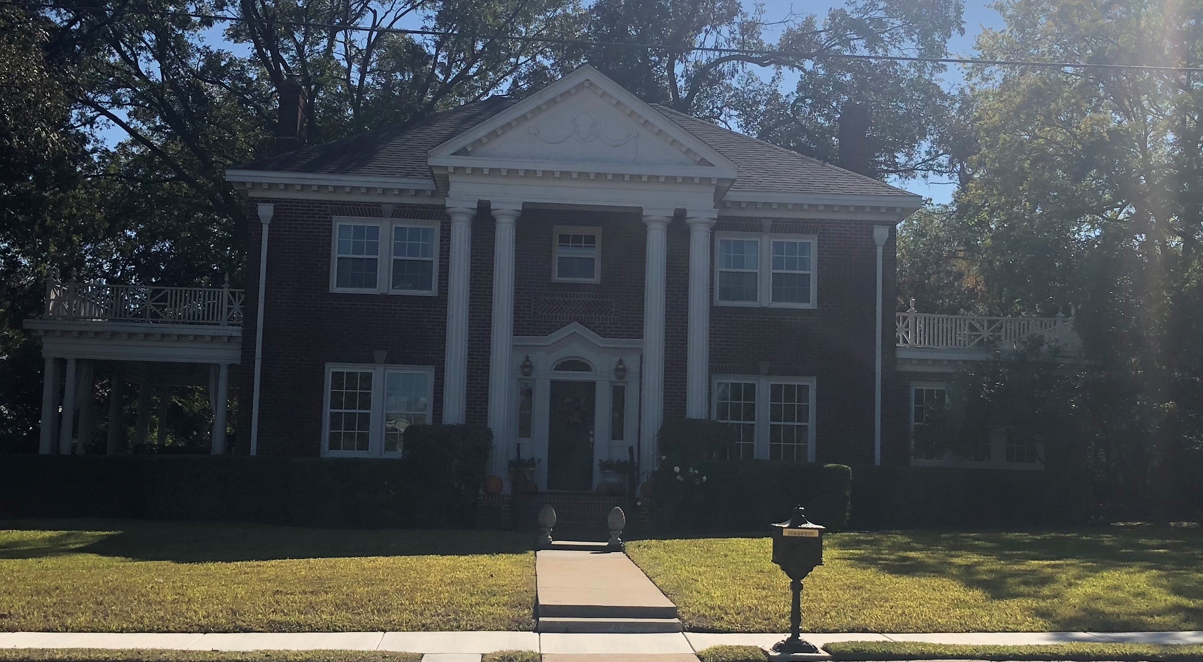 Watercolor painting of a large brick house with white columns and a walkway.