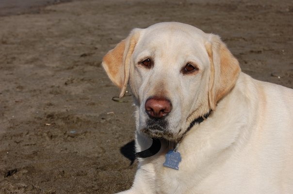 Colored pencil drawing of a yellow Labrador Retriever on a beach