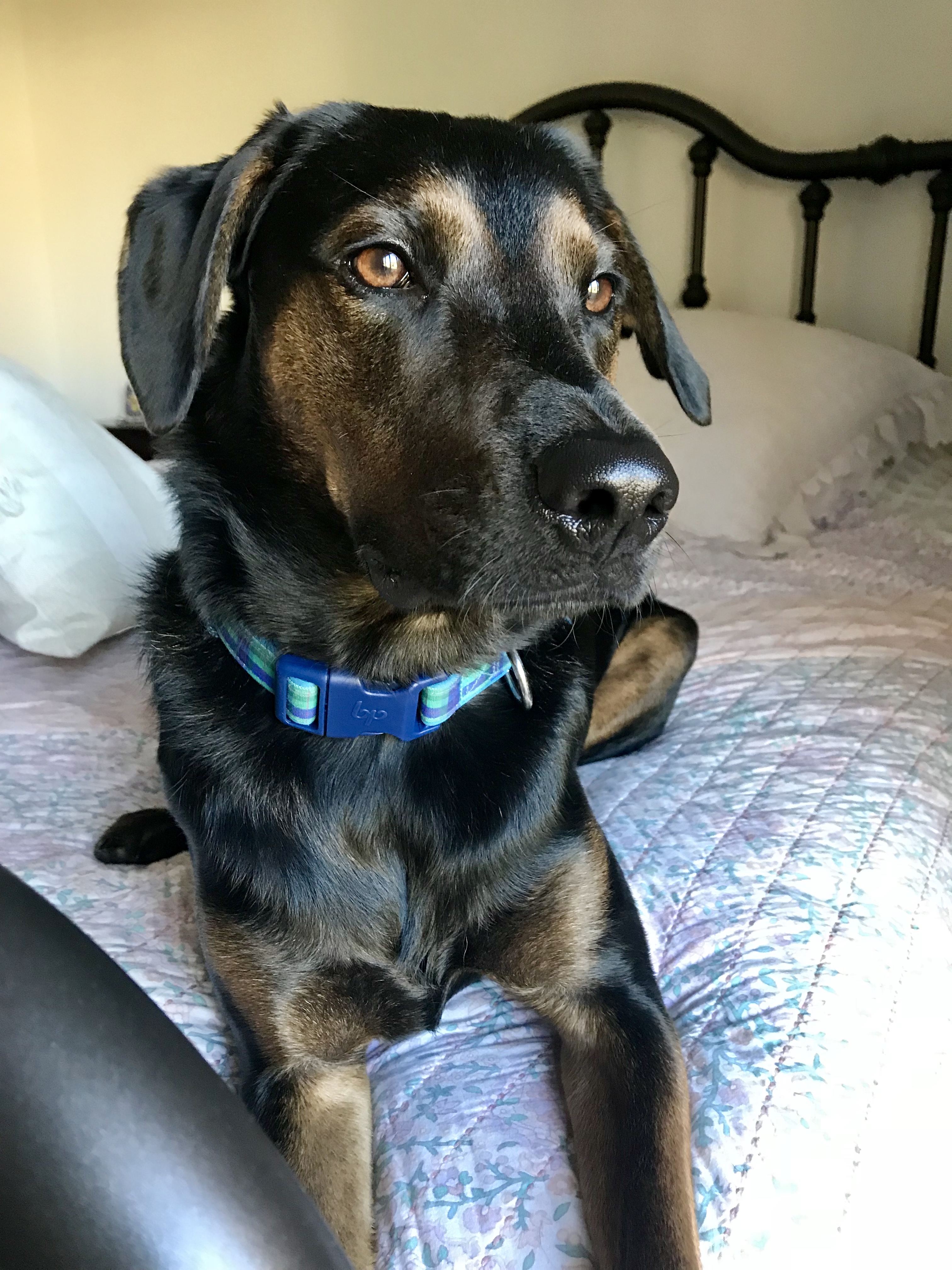 Colored pencil drawing of a dark-haired dog wearing a blue collar, sitting on a bed.