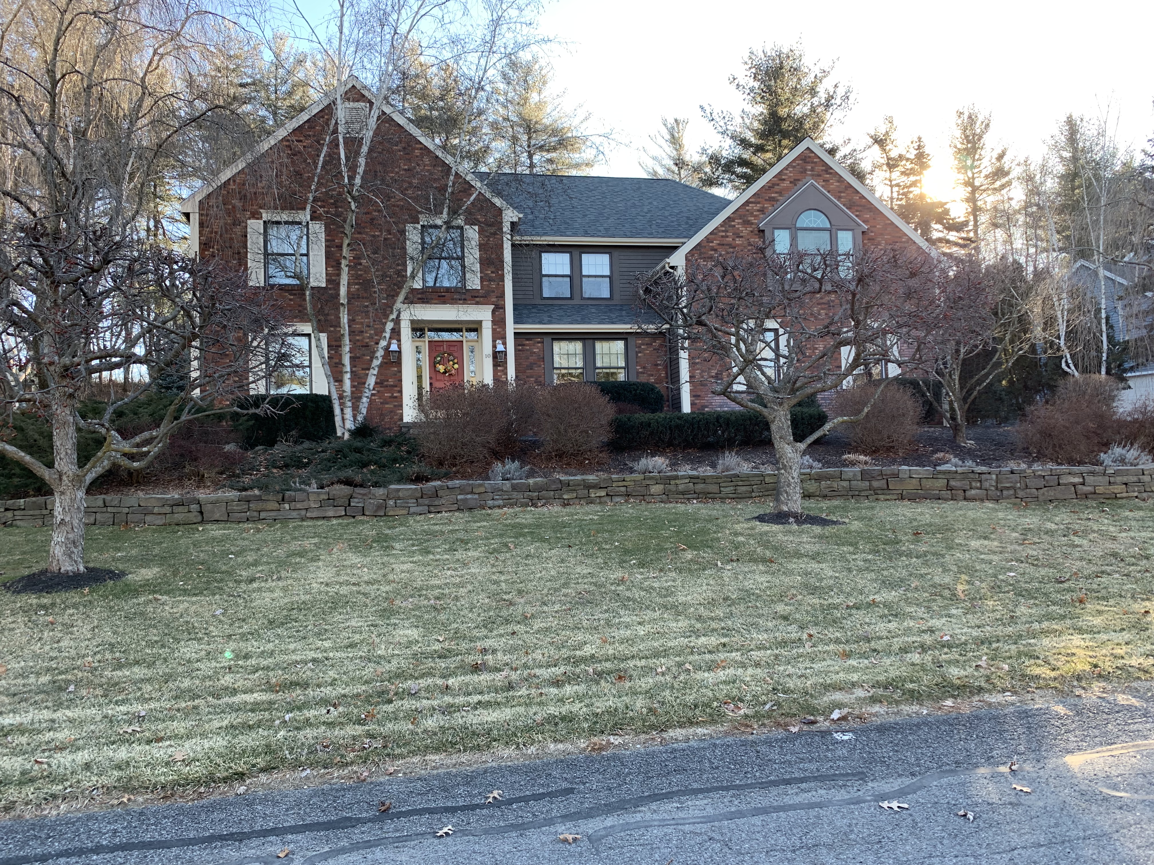 Watercolor painting of a light yellow house with blue shutters and a wreath on the door.