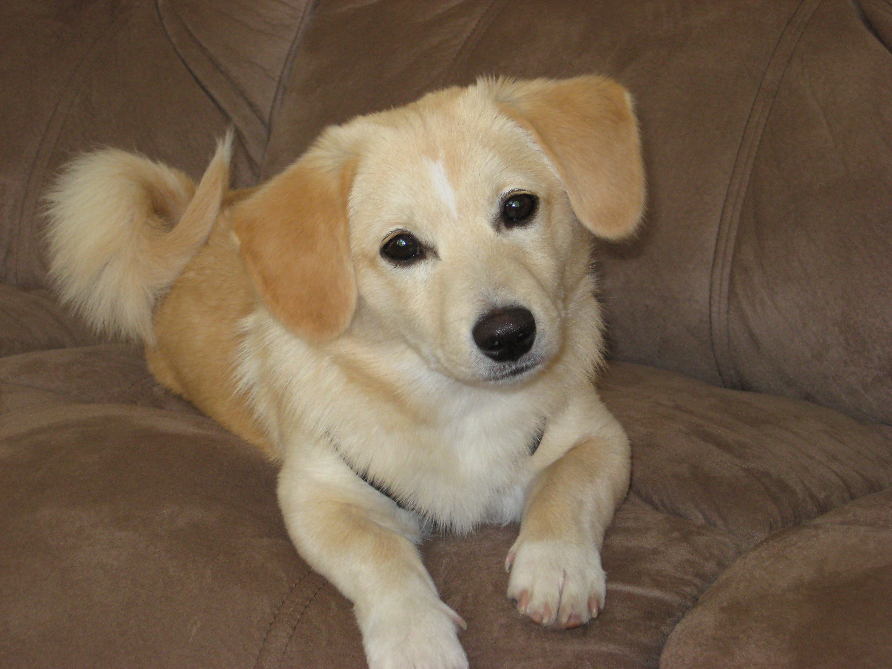 Colored pencil drawing of a light tan dog lying on a brown couch.