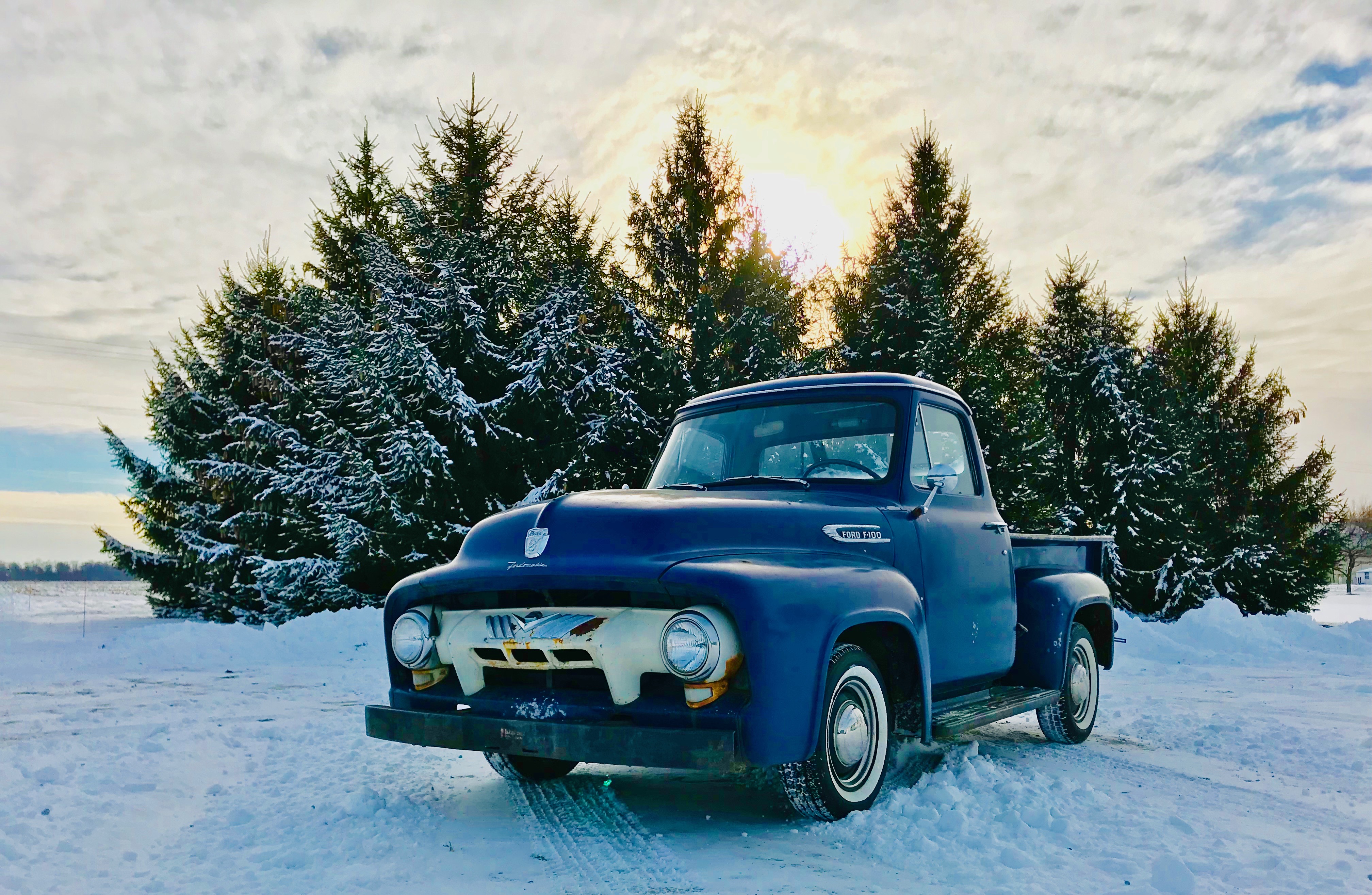 Blue vintage Ford pickup truck in snowy landscape with evergreens.