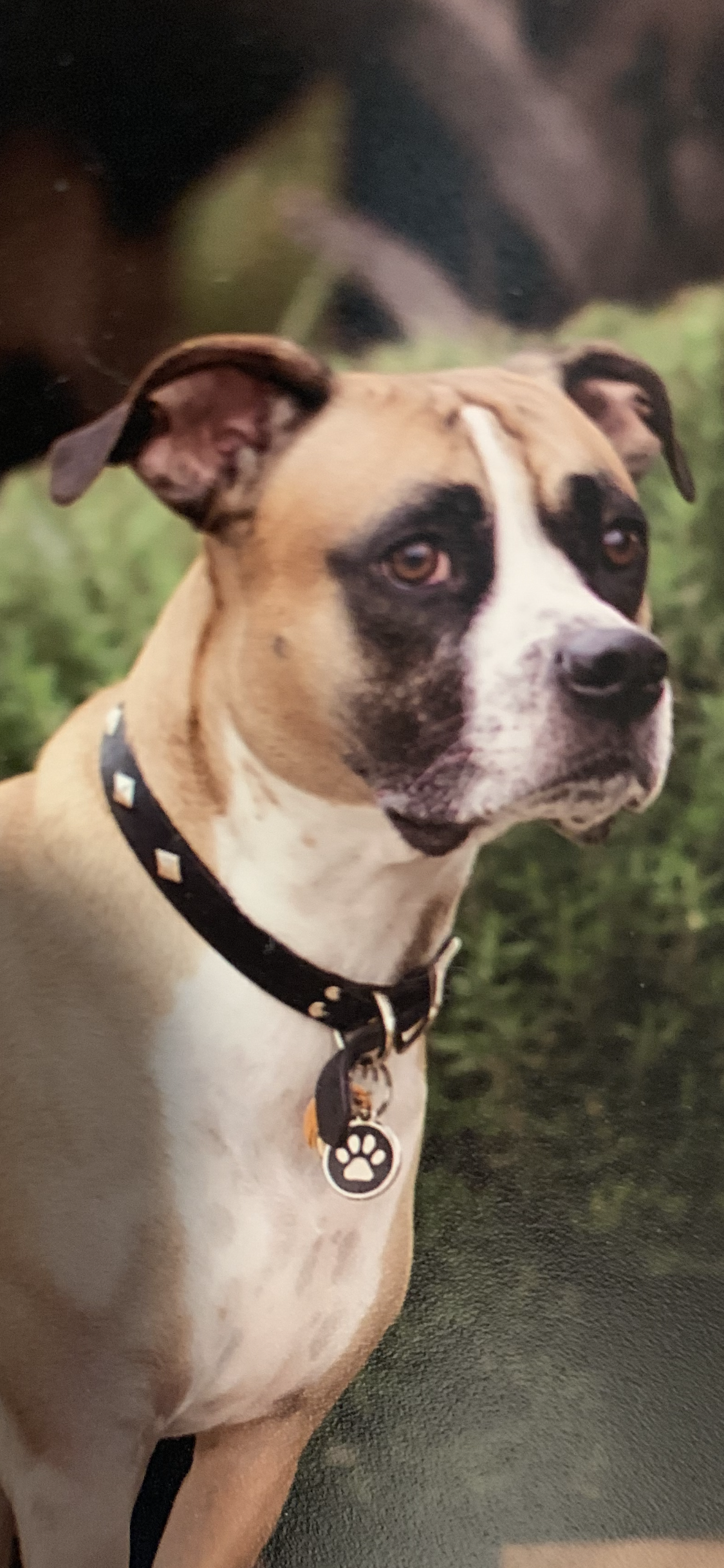 Painting of a tan and white dog wearing a black collar with a paw print tag.