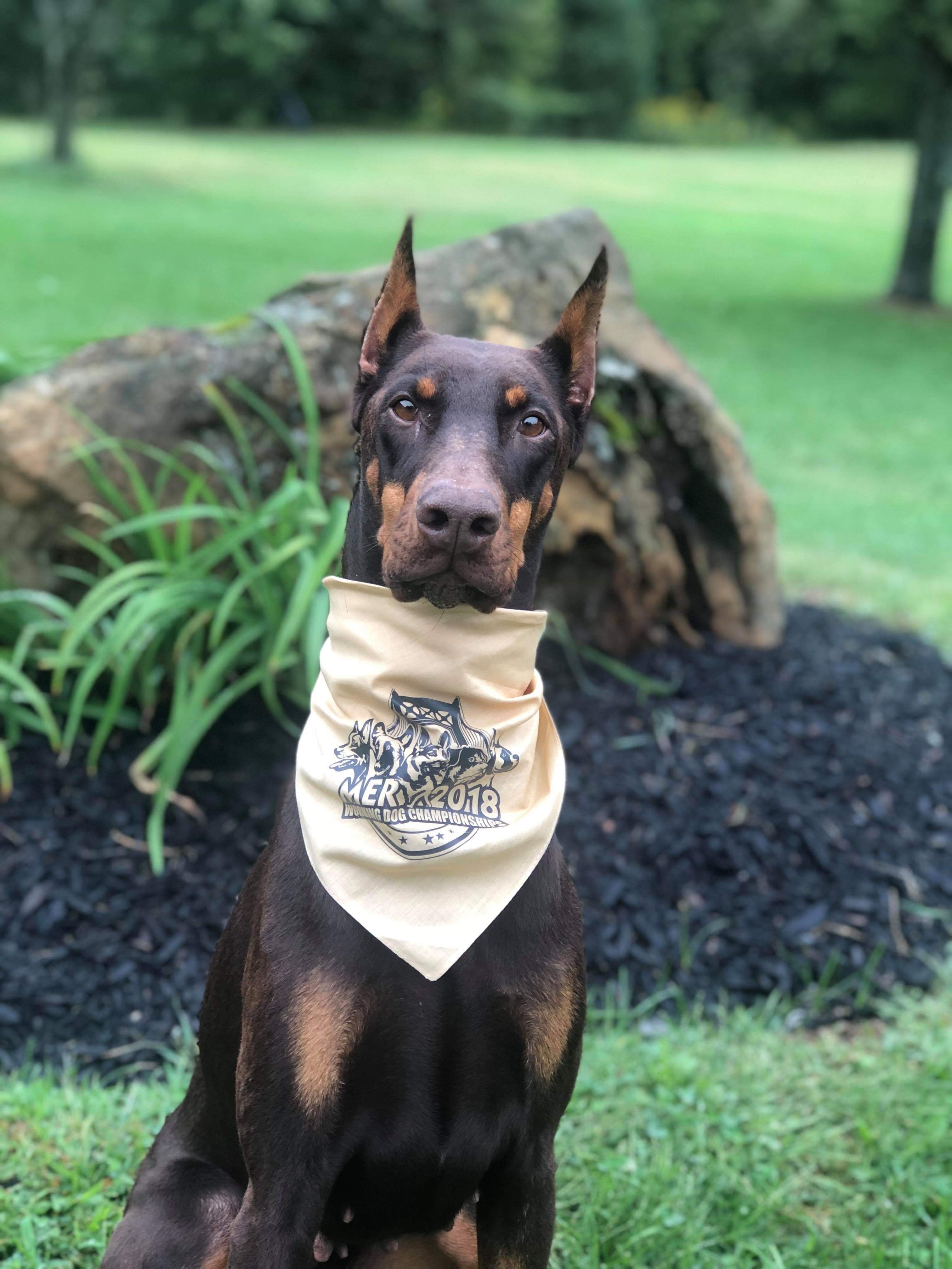 Painting of a Doberman Pinscher wearing a bandana that says MERA 2018