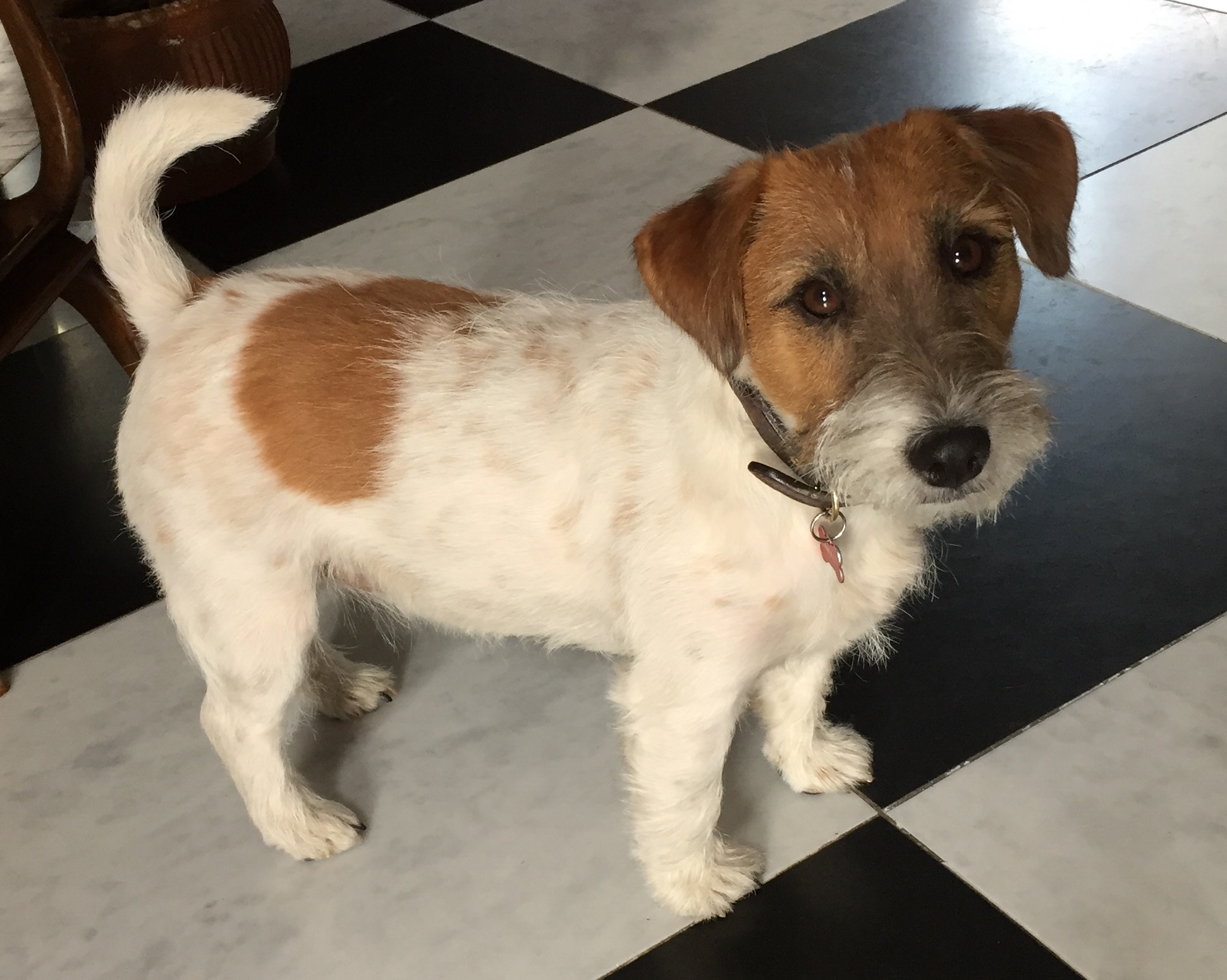 Colored pencil drawing of a Jack Russell terrier on a checkered floor.
