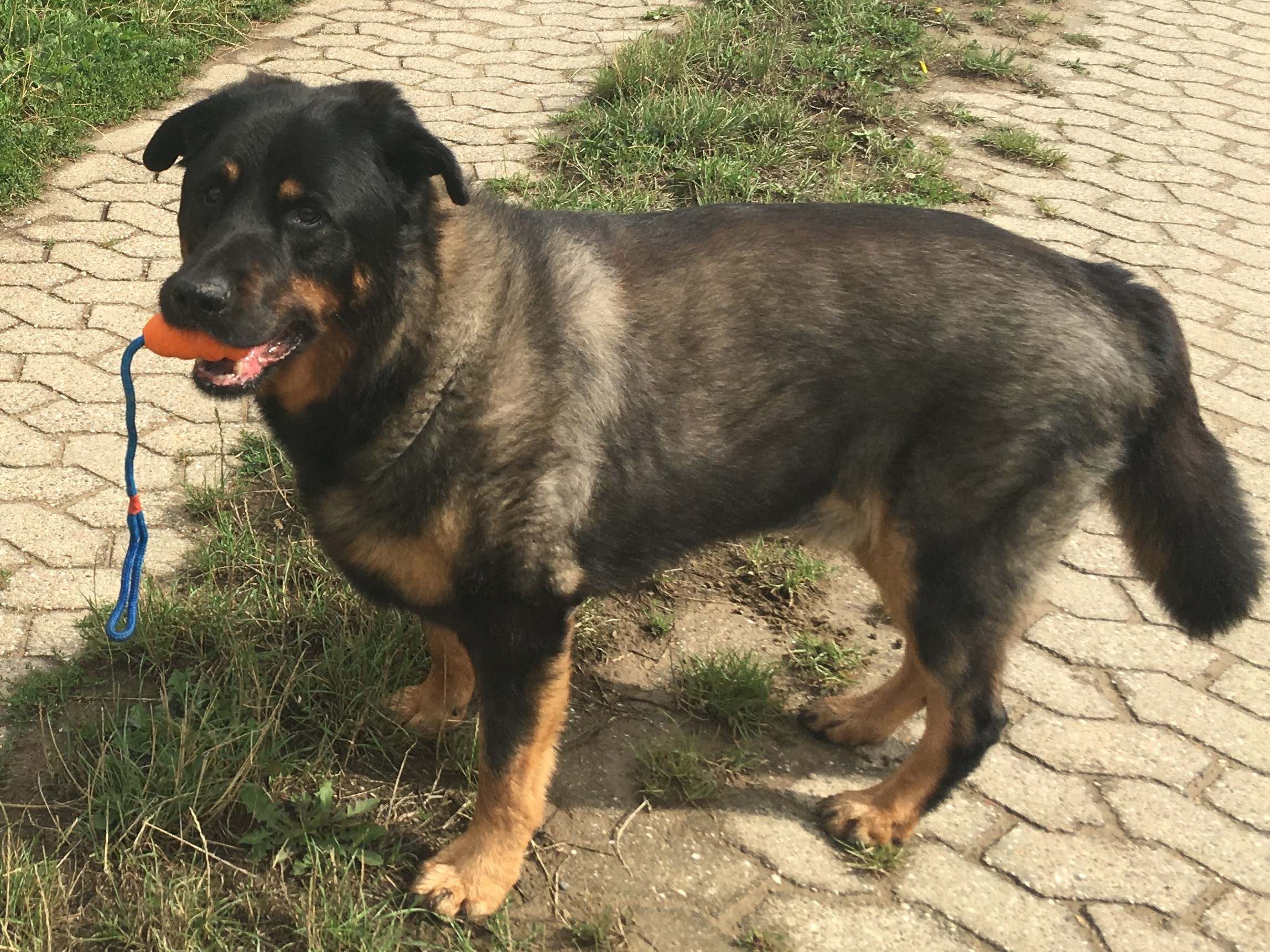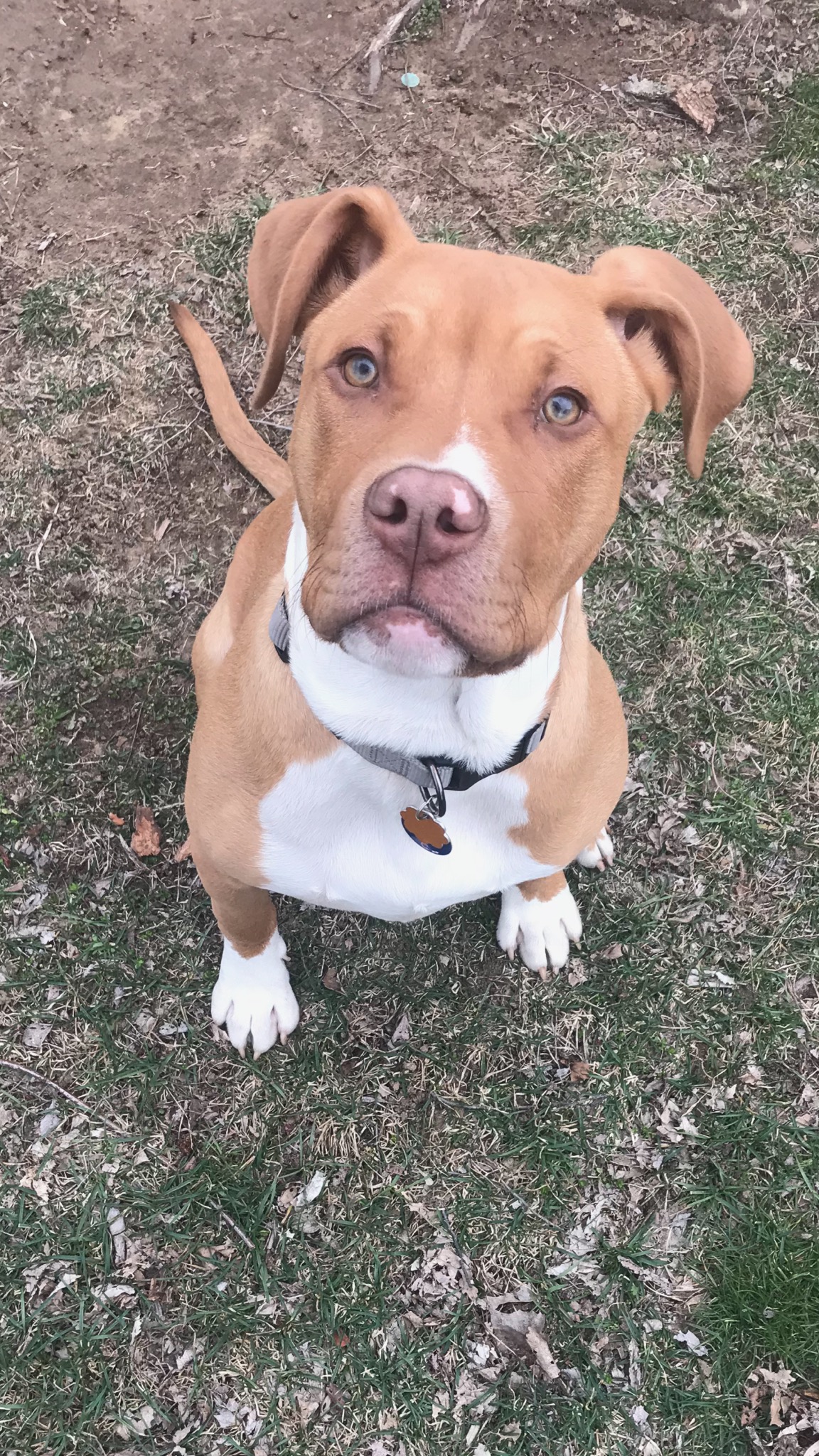 Painting of a light brown Pit Bull terrier mix looking up from the ground.
