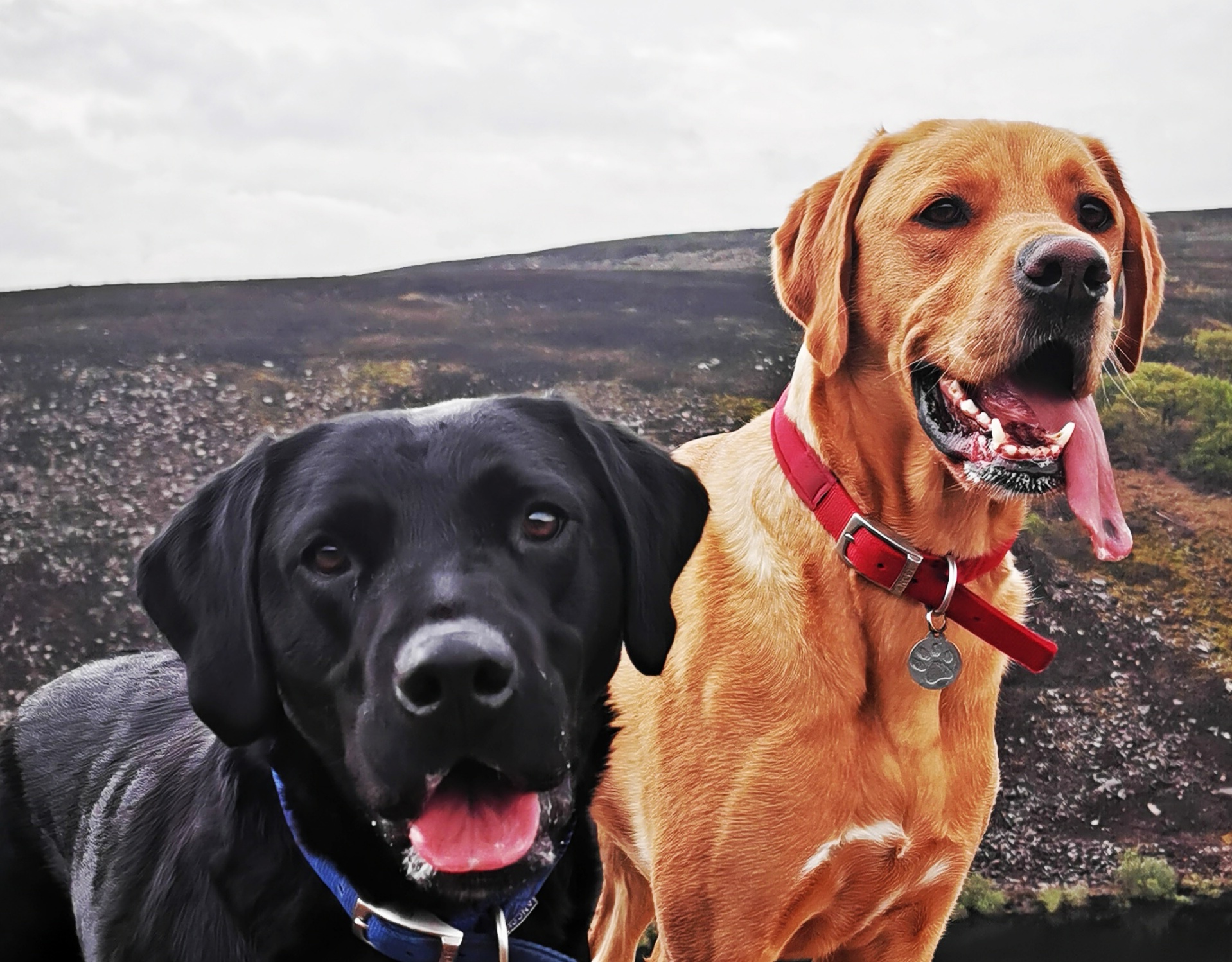 Painting of a black Labrador and a yellow Labrador standing outdoors.
