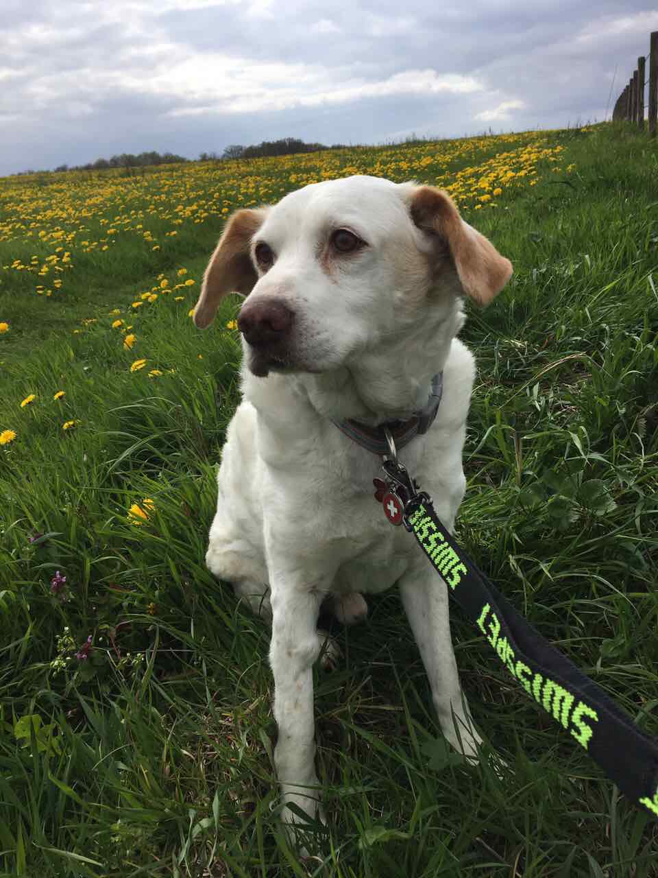 Painting of a white dog with tan ears sitting in a field of yellow flowers.