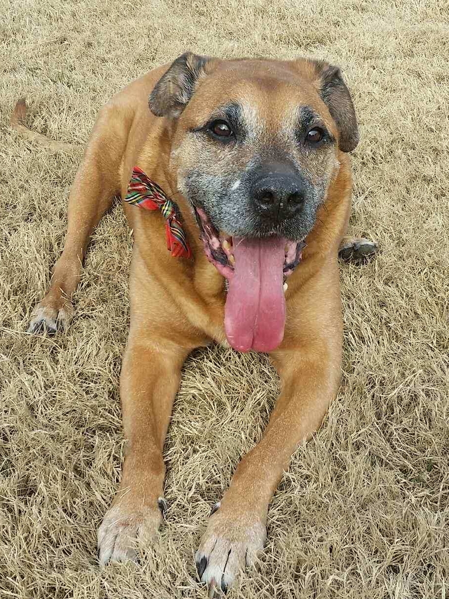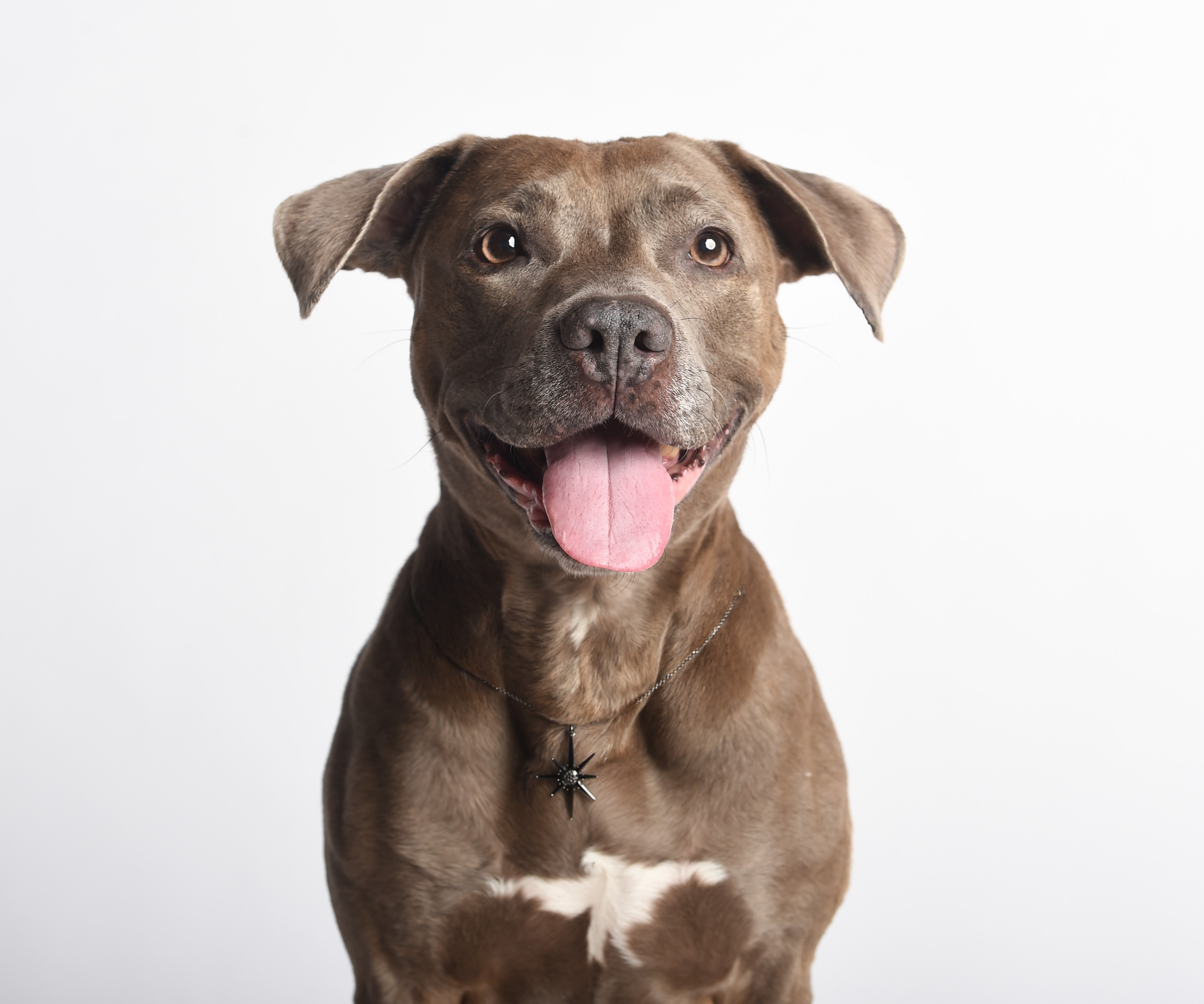 Painting of a brown pit bull with its tongue out wearing a necklace.