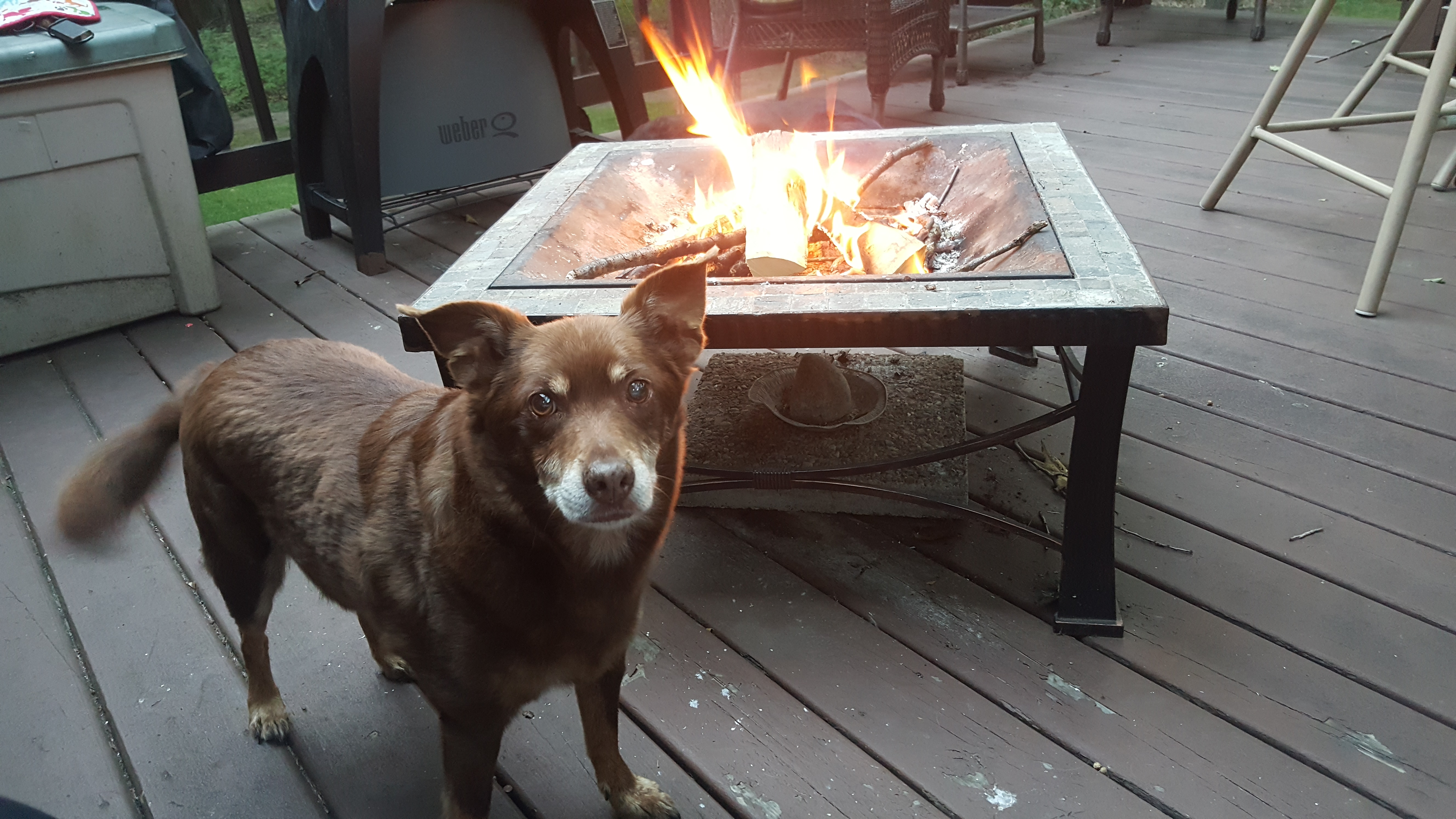 Colored pencil drawing of a brown dog near a fire pit.
