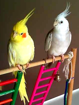 Painting of two cockatiels on a perch with a small red ladder and bell.