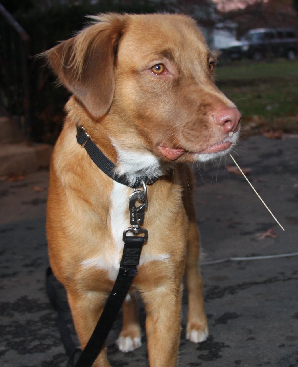 Painting of a light brown dog with white chest fur wearing a black collar.