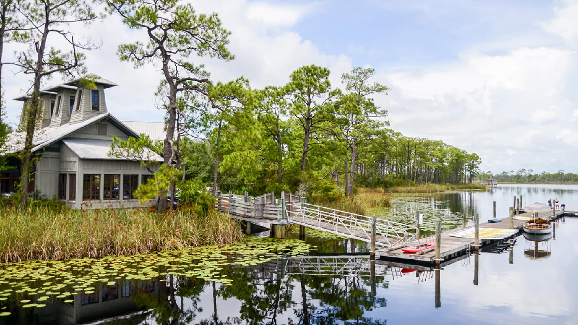 Watercolor painting of a waterfront building with a dock and boats.
