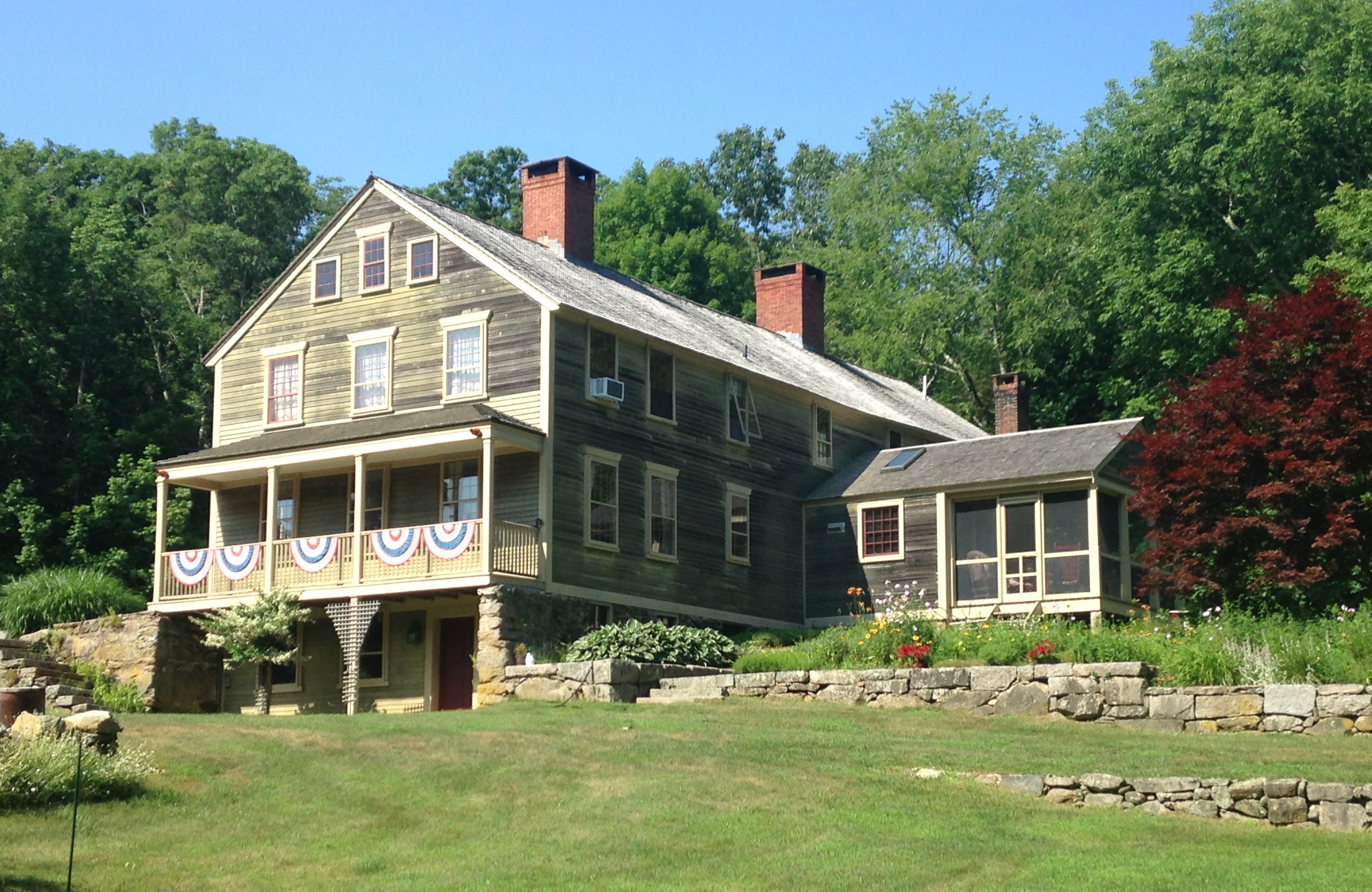 Watercolor painting of a large gray house with a porch decorated with bunting, and a smaller attached building, all situated on a grassy lawn with a stone wall.