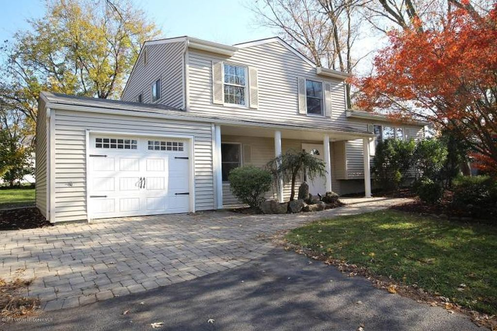 Watercolor painting of a suburban house with an attached garage, vibrant fall foliage, and a green lawn.