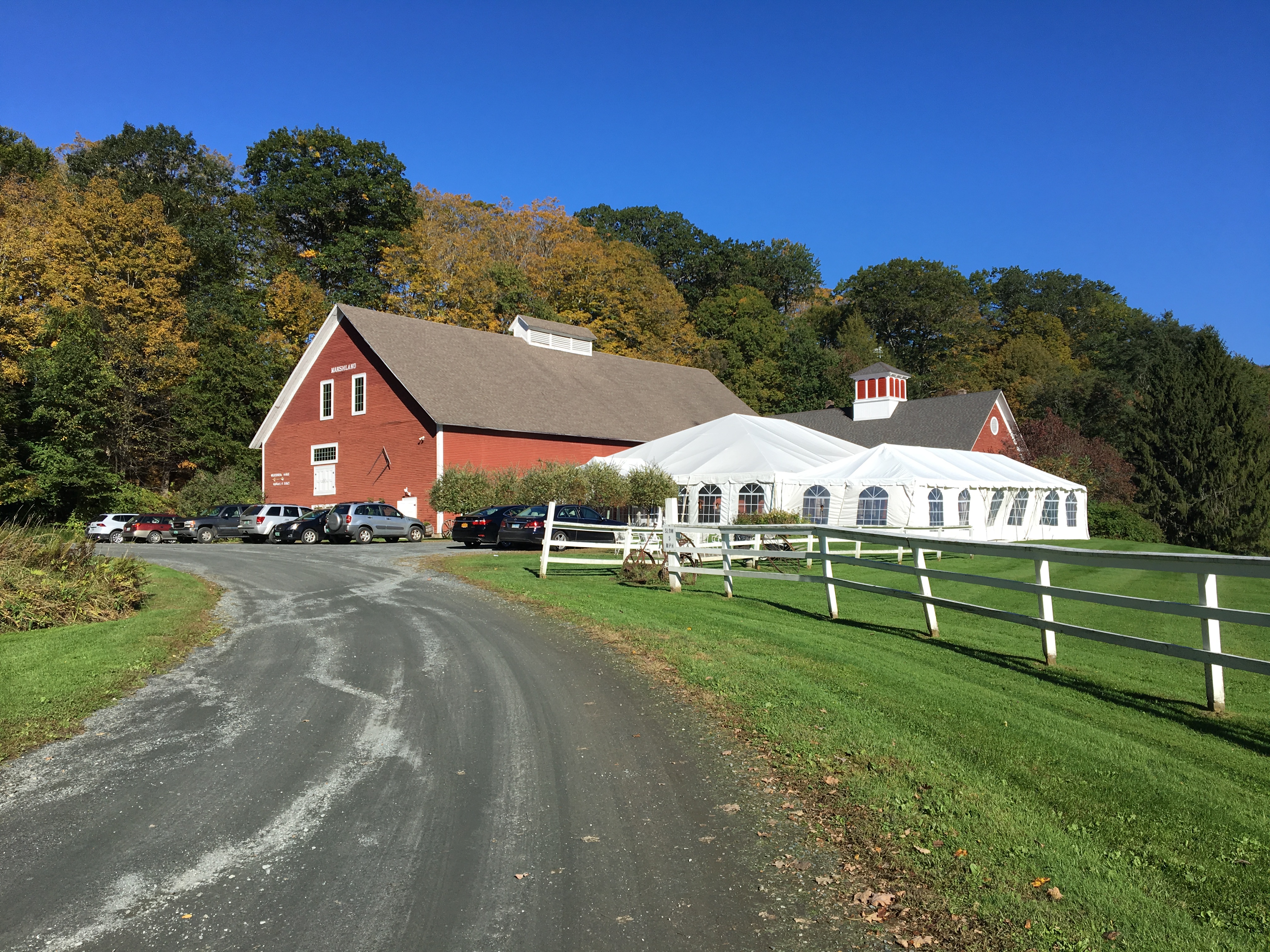 Watercolor painting of a red barn with a large white tent in front, surrounded by trees and a white fence.