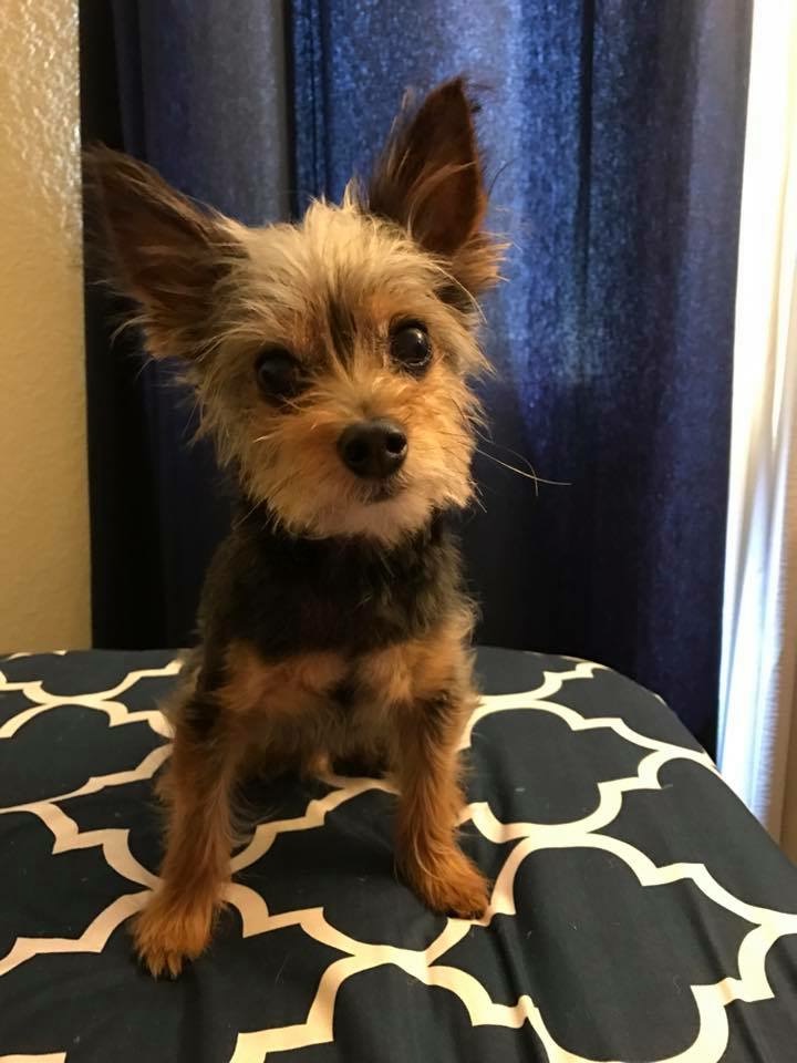 Watercolor painting of a Yorkshire Terrier sitting on a patterned surface.