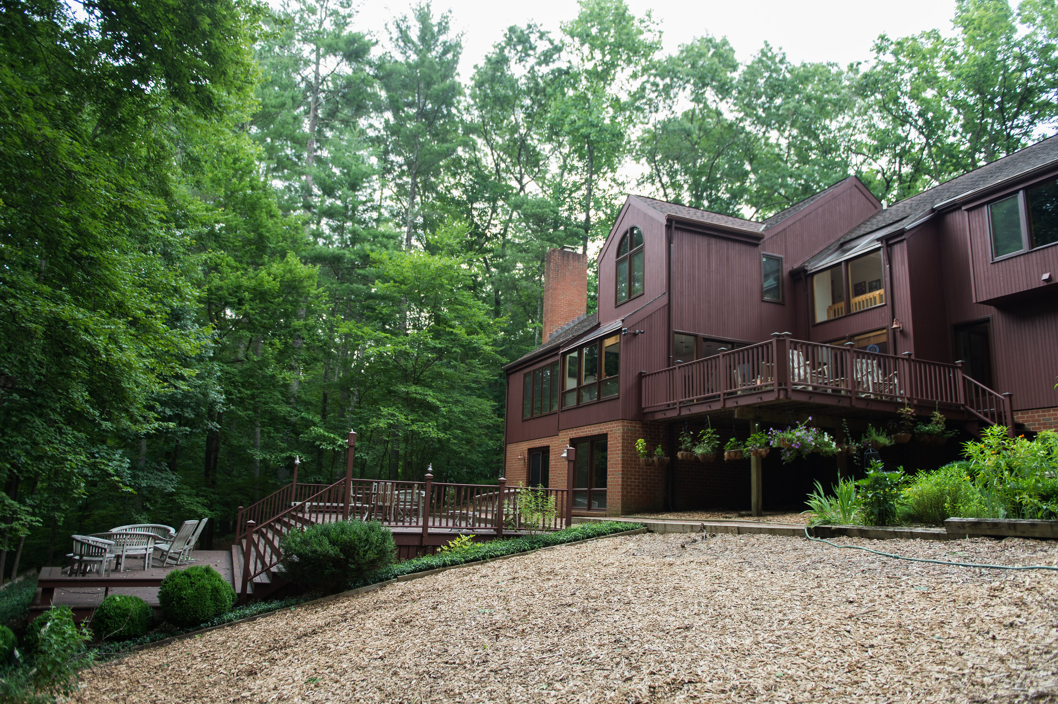 Watercolor painting of a multi-level reddish-brown house with a large deck, surrounded by lush green trees and landscaping.