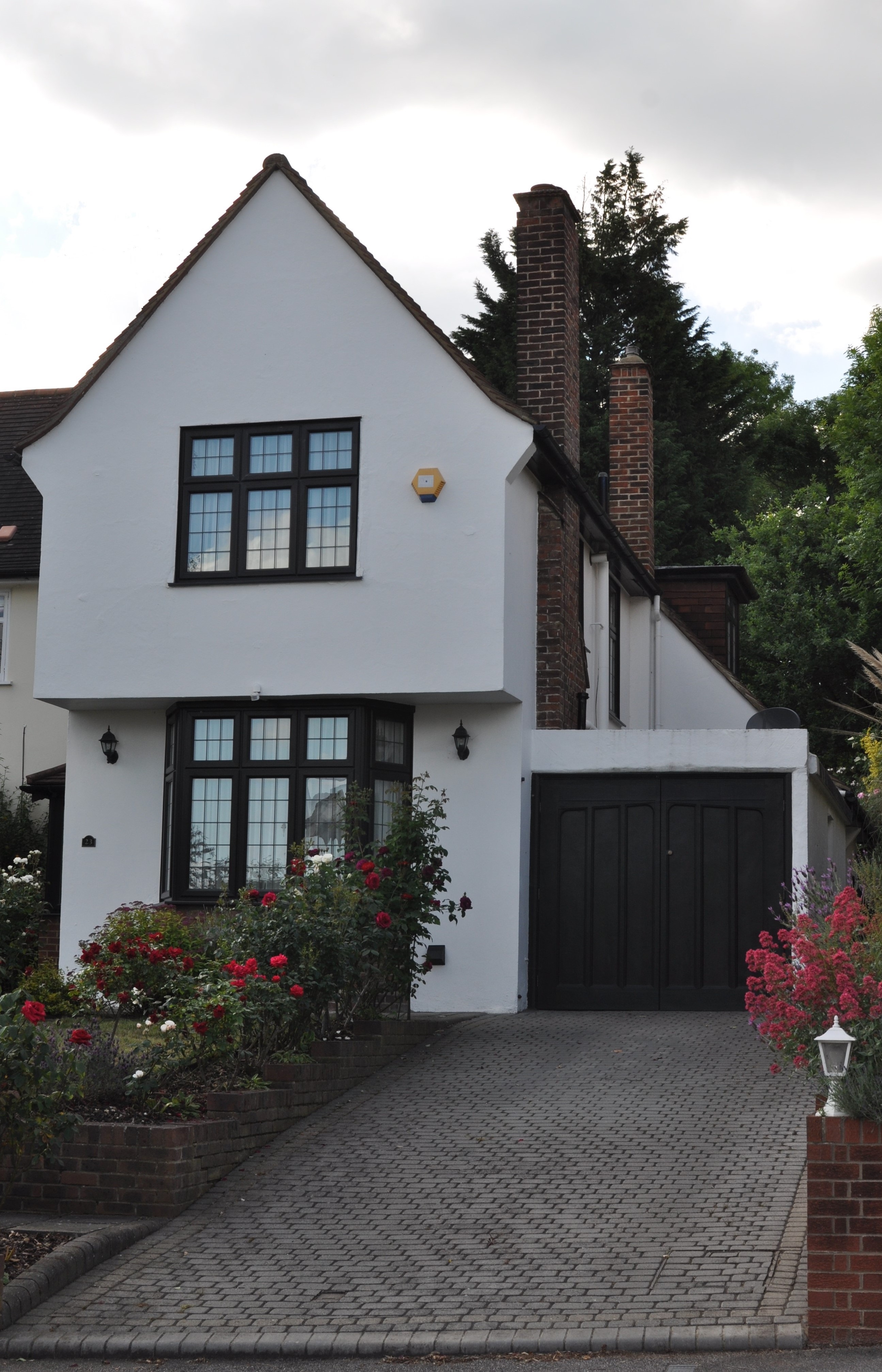 Watercolor painting of a white house with dark windows and a rose garden in front.