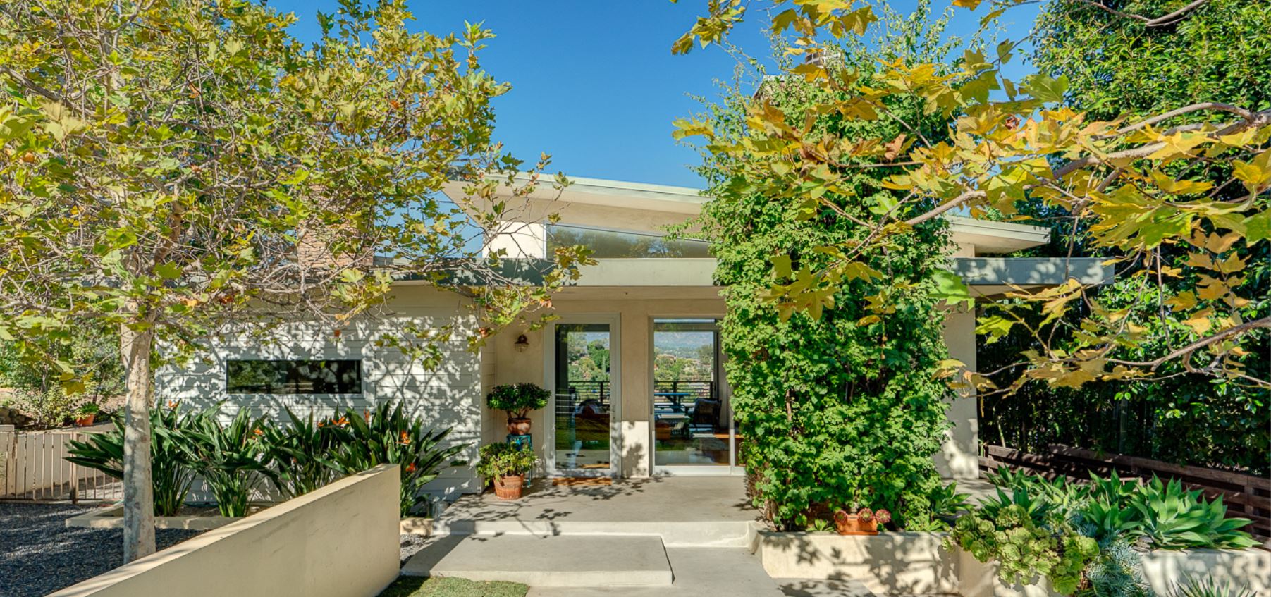 Watercolor painting of a modern house entrance surrounded by lush greenery.