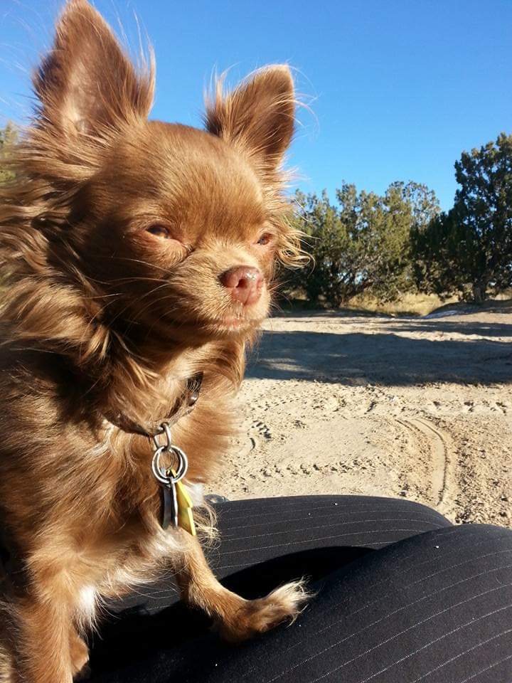 Painting of a long-haired brown chihuahua wearing a collar outdoors.
