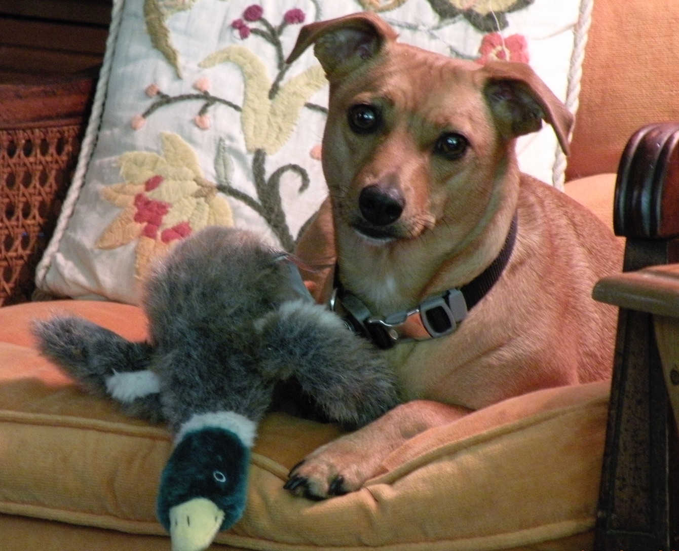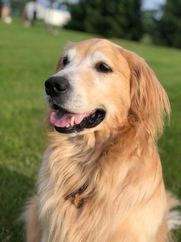 Painting of a happy brown dog wearing a blue bandana in green grass