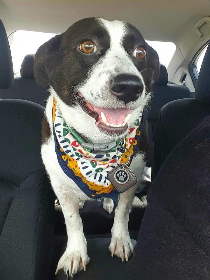 Painting of a smiling black and white dog wearing a bandana and tag.