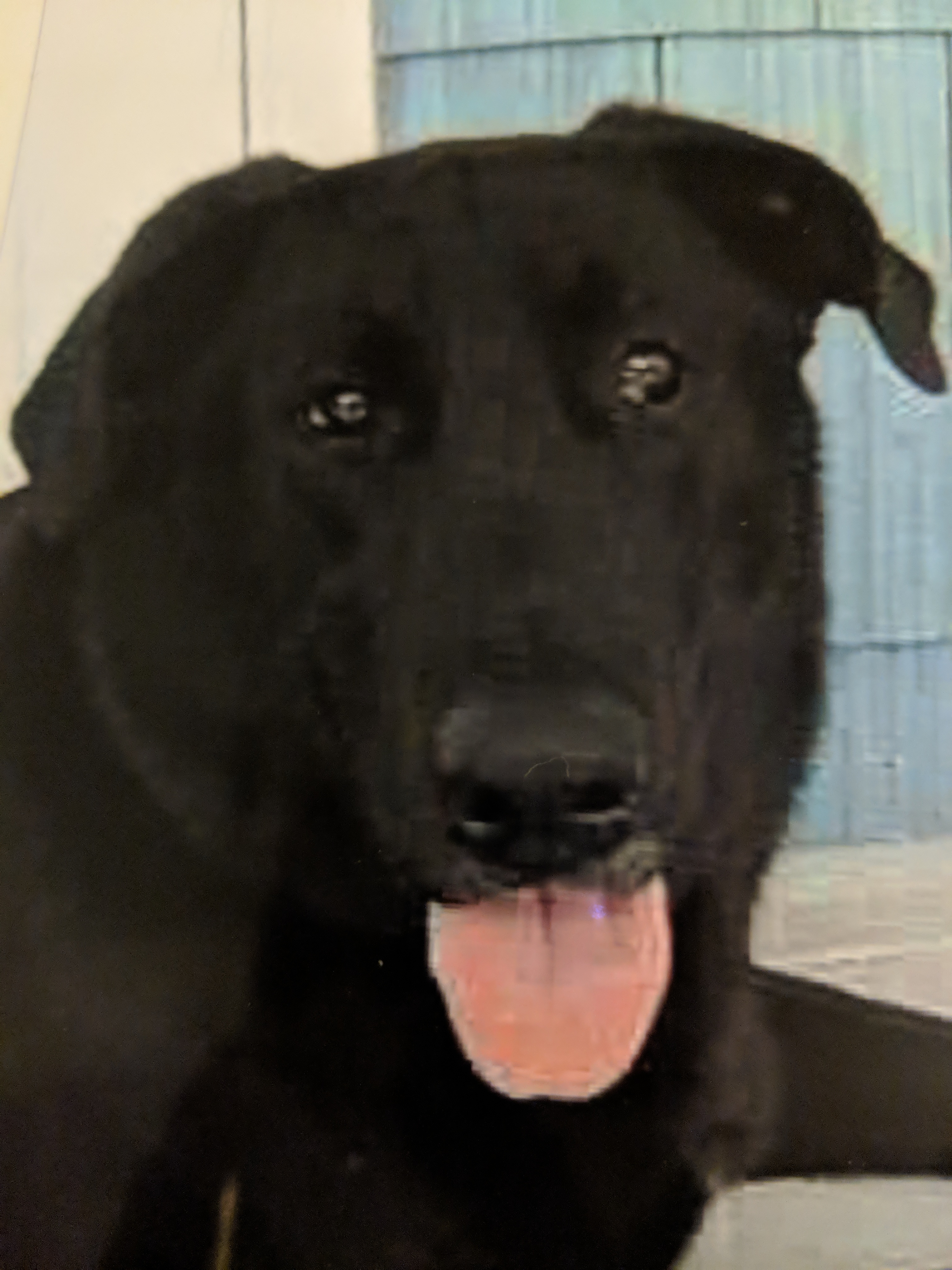 Painting of a black dog with its mouth open, panting.