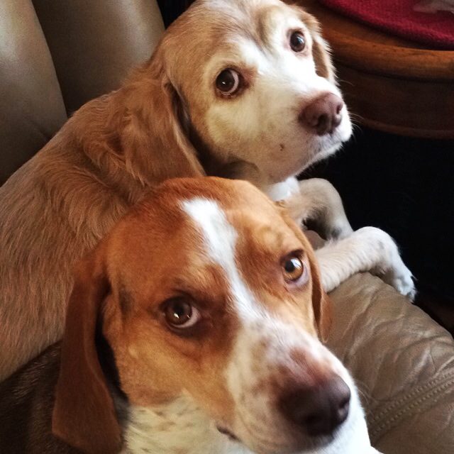 Painting of a tan and black dog wearing a teal collar, resting on white bedding against a green background