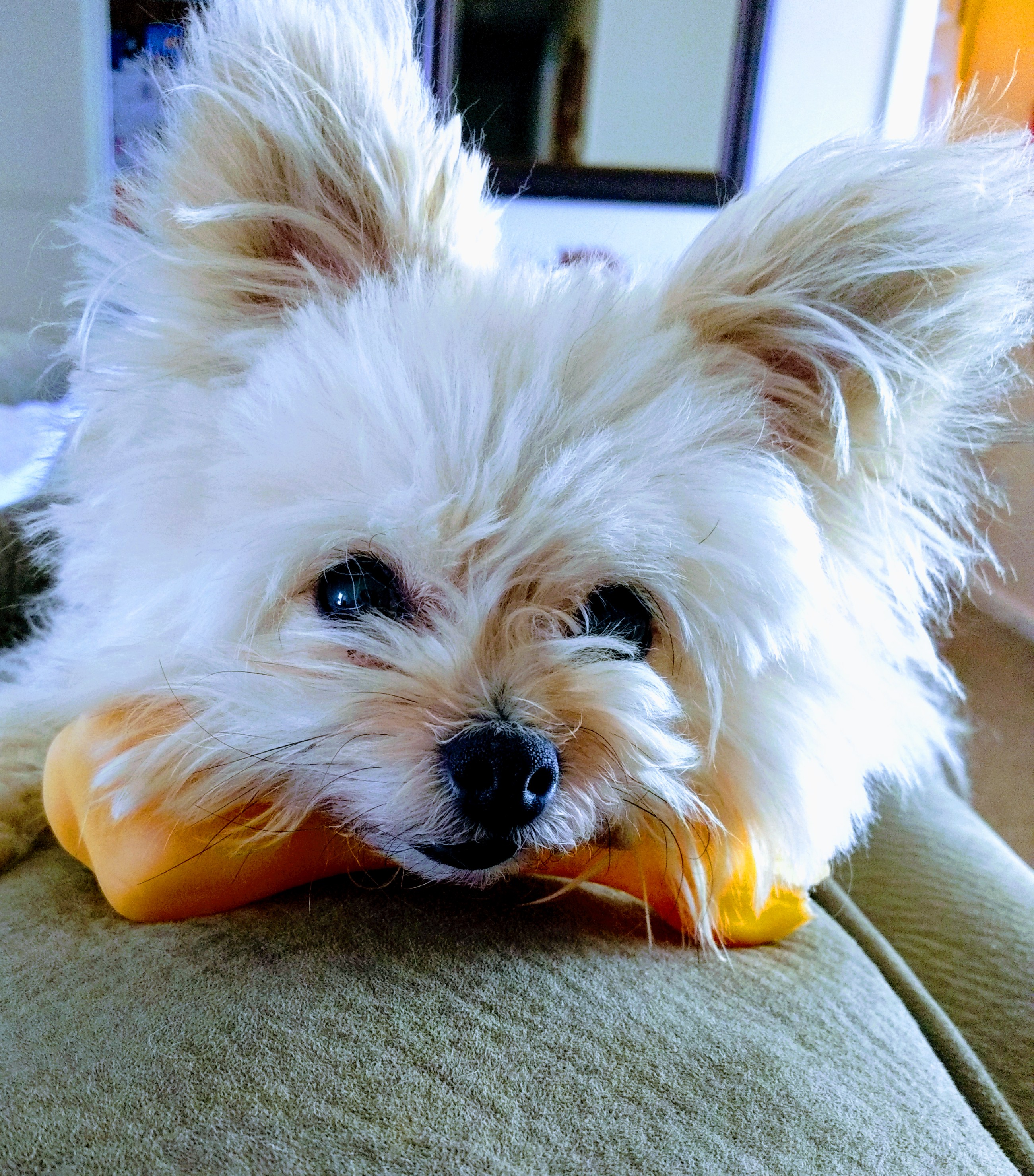 Painting of a small, fluffy, white dog with dark eyes resting its chin on an orange object.