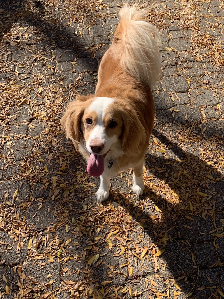 Colored pencil drawing of a long-haired dog standing on a cobblestone path covered in autumn leaves.