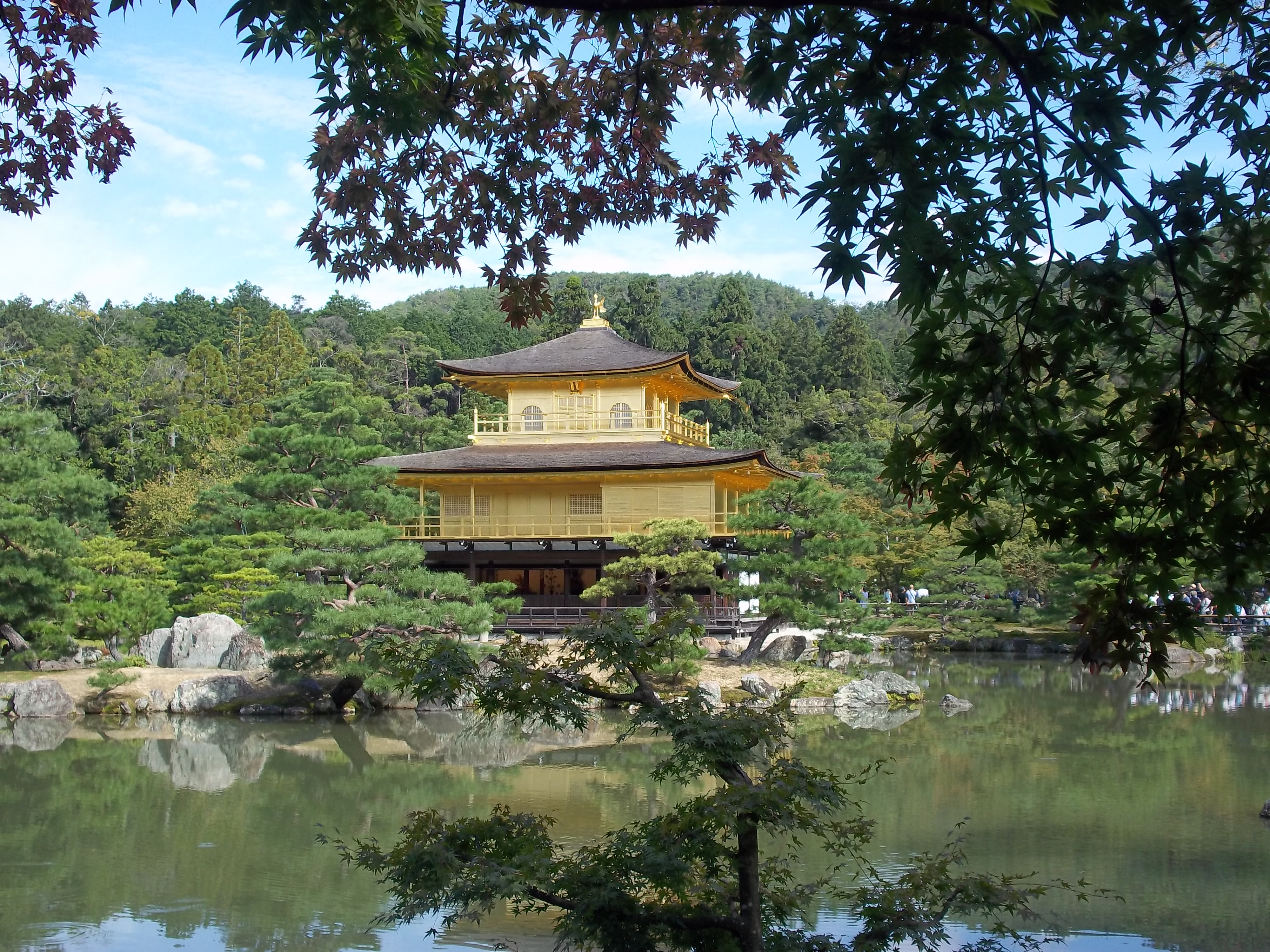 Colored pencil drawing of Kinkaku-ji temple in Japan, partially obscured by trees.