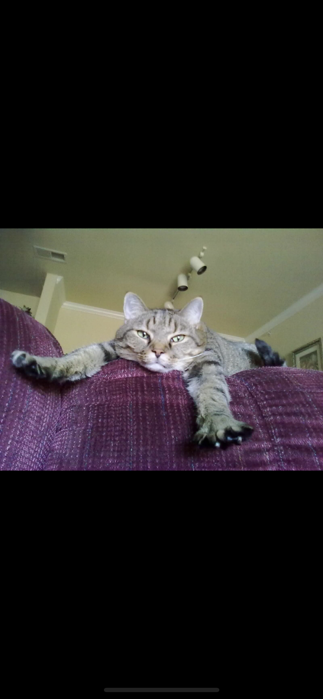Black and white pencil drawing of a tabby cat lounging on a couch.