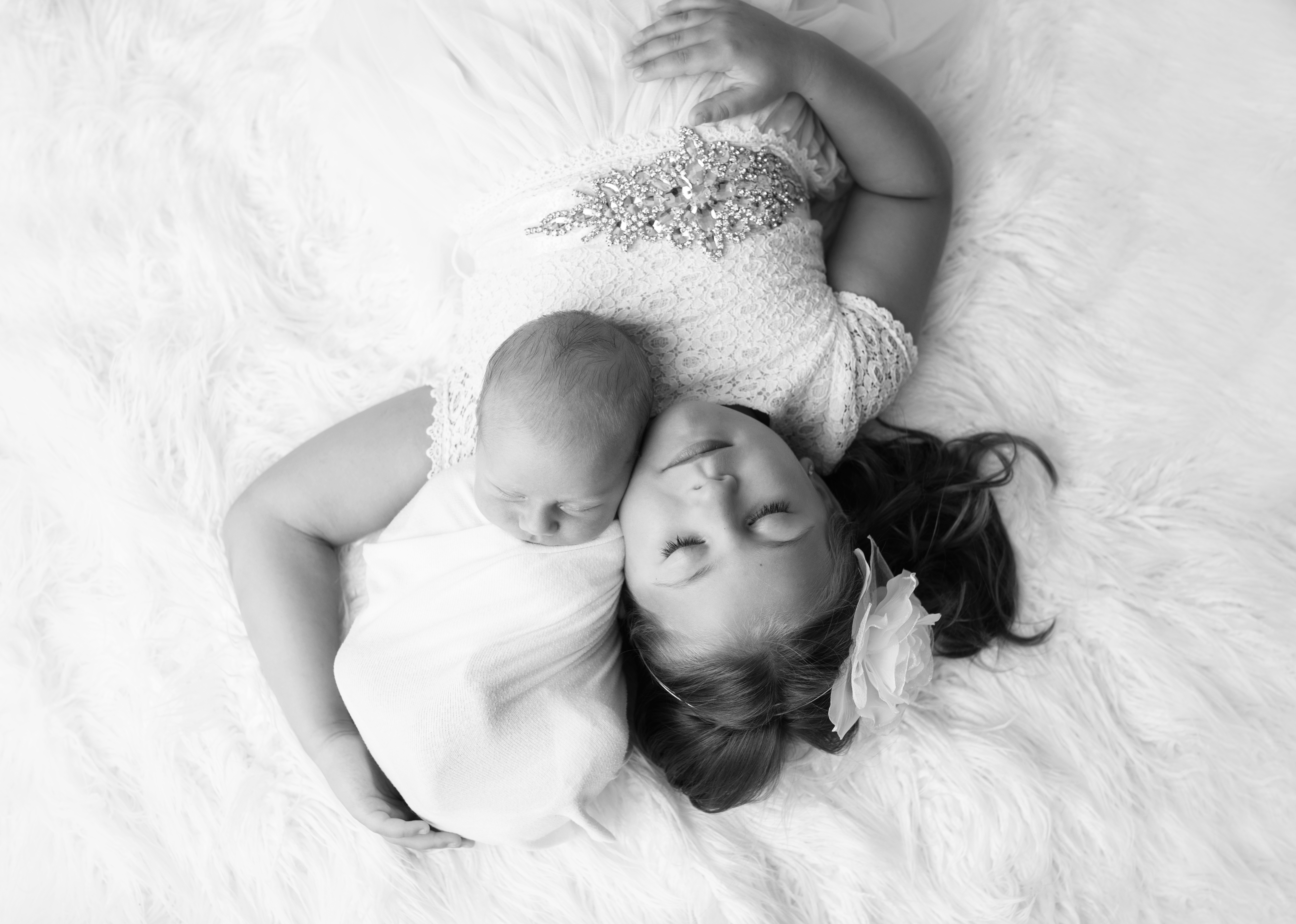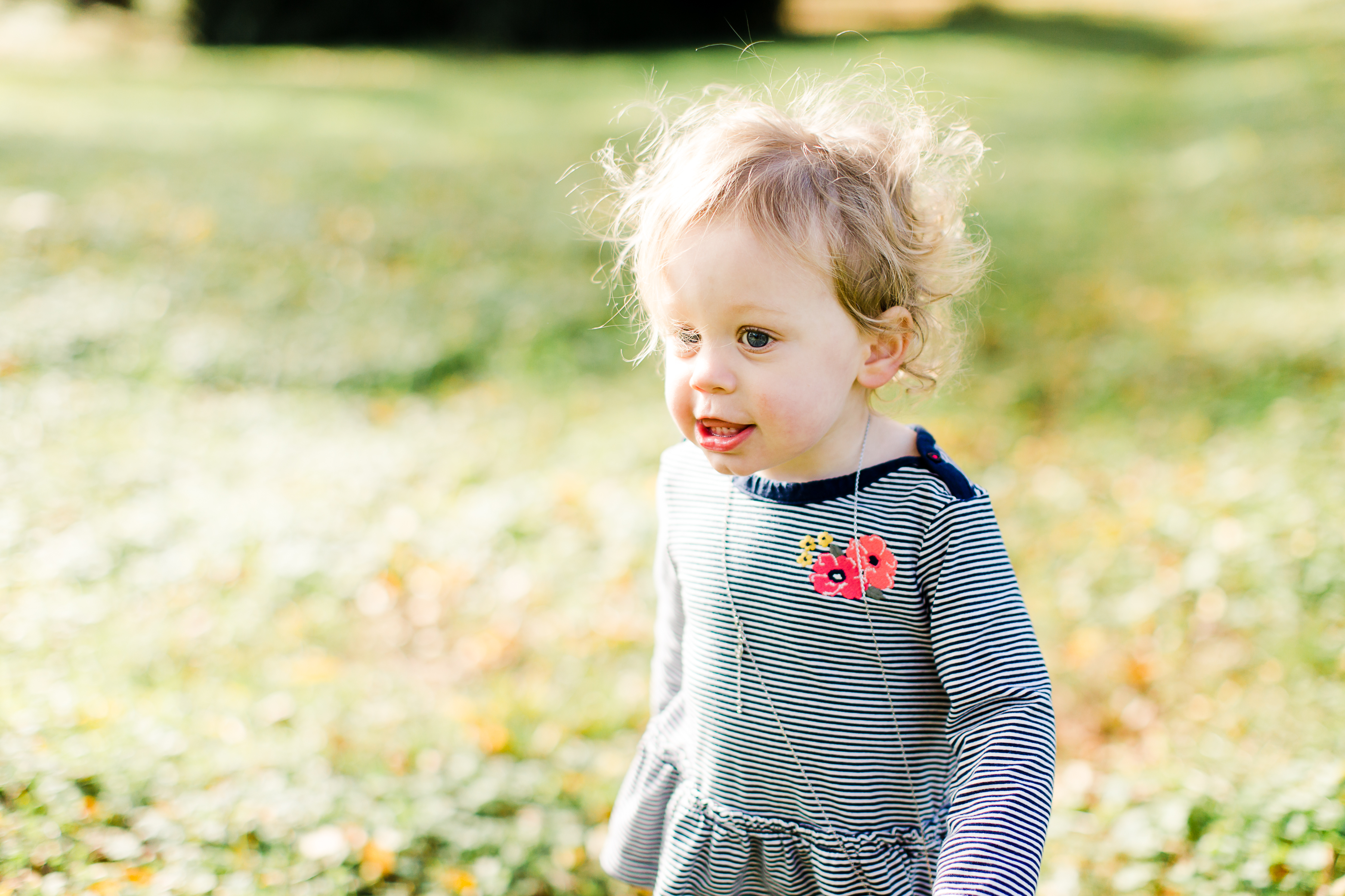 Black and white portrait of a toddler girl with curly hair, wearing a striped shirt.