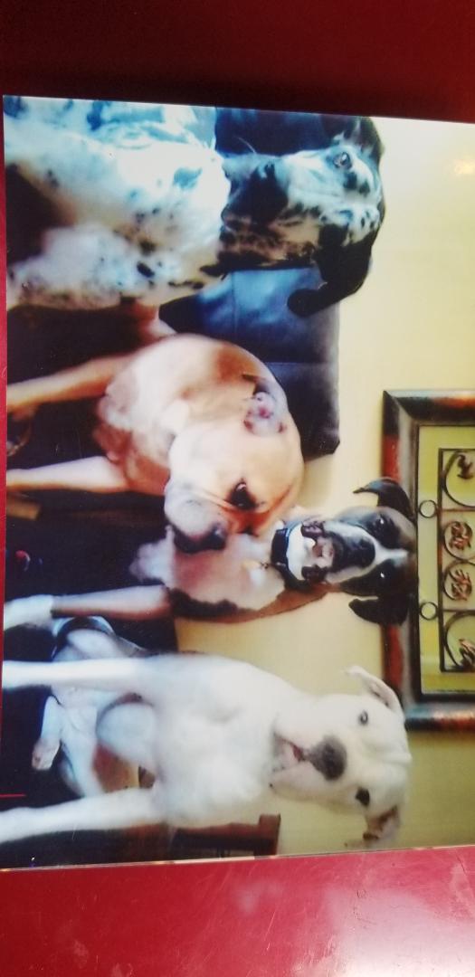 Painting of four dogs: a Great Dane, a brindle Boxer, an American Bulldog, and a fawn-colored dog.
